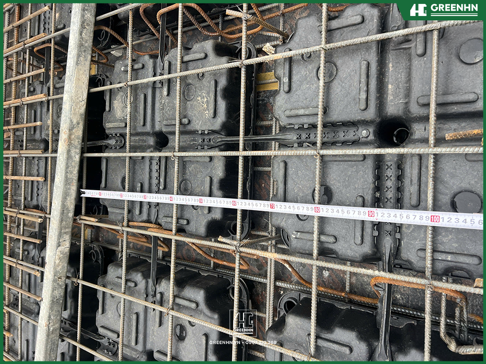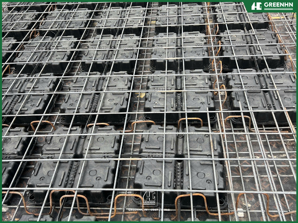 Kỹ thuật GreenHN: Sử dụng đầm dùi đường kính nhỏ (D35/D40), đầm vào khe giữa các hộp, tuyệt đối không chạm vào thành hộp. Góc đầm nghiêng 45 độ để đẩy bê tông vào gầm.
