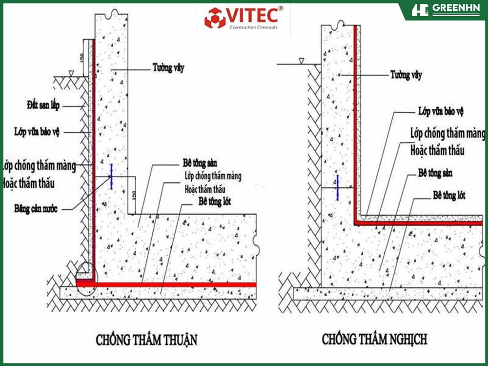 Chống thấm thuận: Thi công lớp chống thấm từ phía mặt ngoài của vách hầm (mặt tiếp xúc trực tiếp với nguồn nước/đất). Đây là phương pháp hiệu quả nhất và được GreenHN ưu tiên, vì nó ngăn chặn nước ngay từ bên ngoài, không cho nước thấm vào kết cấu.