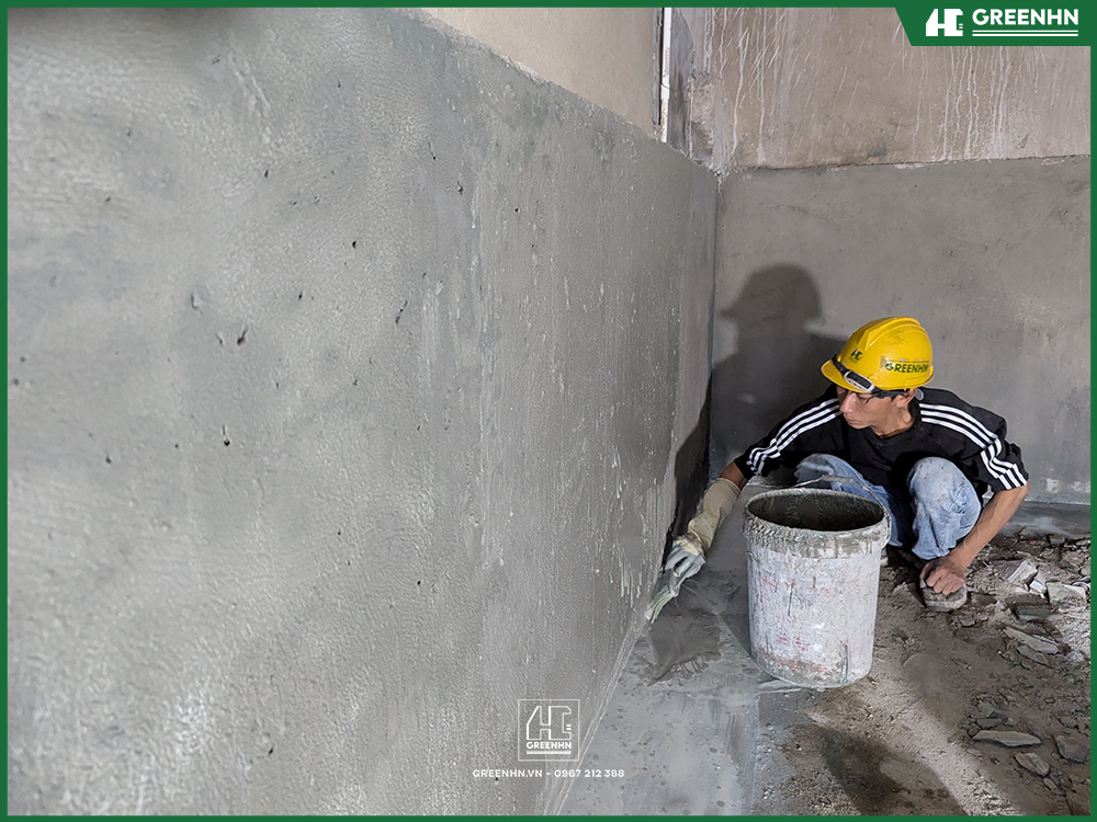 Quét hóa chất chống thấm gốc xi măng: Quét đều 2-3 lớp theo đúng định mức và thời gian chờ khô.