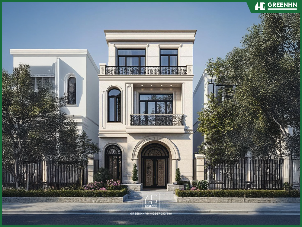 Với những lô đất nhà phố có mặt tiền rộng từ 7m trở lên, GreenHN đề xuất thiết kế song lập tạo cảm giác bề thế như một dinh thự. Hệ thống cửa vòm cong là điểm nhấn đắt giá của phong cách này trong năm 2026.
