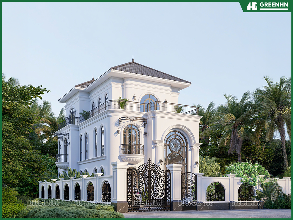 Khác với sự cầu kỳ của cổ điển xưa, mẫu biệt thự này lược bỏ các phù điêu rườm rà. Thay vào đó là những đường phào chỉ thanh mảnh, tỉ lệ hình khối chuẩn mực và hệ mái Mansard uy nghi. Màu trắng sứ hoặc kem là tông chủ đạo.