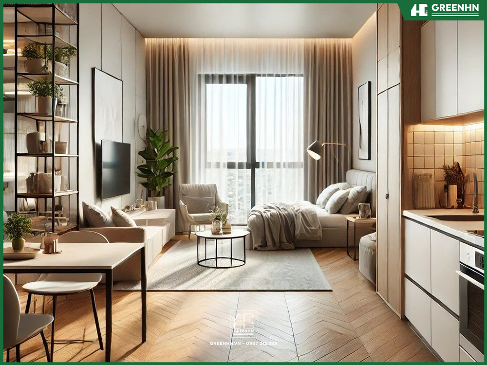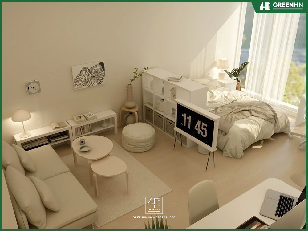 Sử dụng tông màu trắng, kem hoặc xanh pastel làm chủ đạo để tăng diện tích, tạo cảm giác rộng rãi hơn thực tế. Nội thất tích hợp thông minh như giường có ngăn kéo, bàn gấp treo tường.