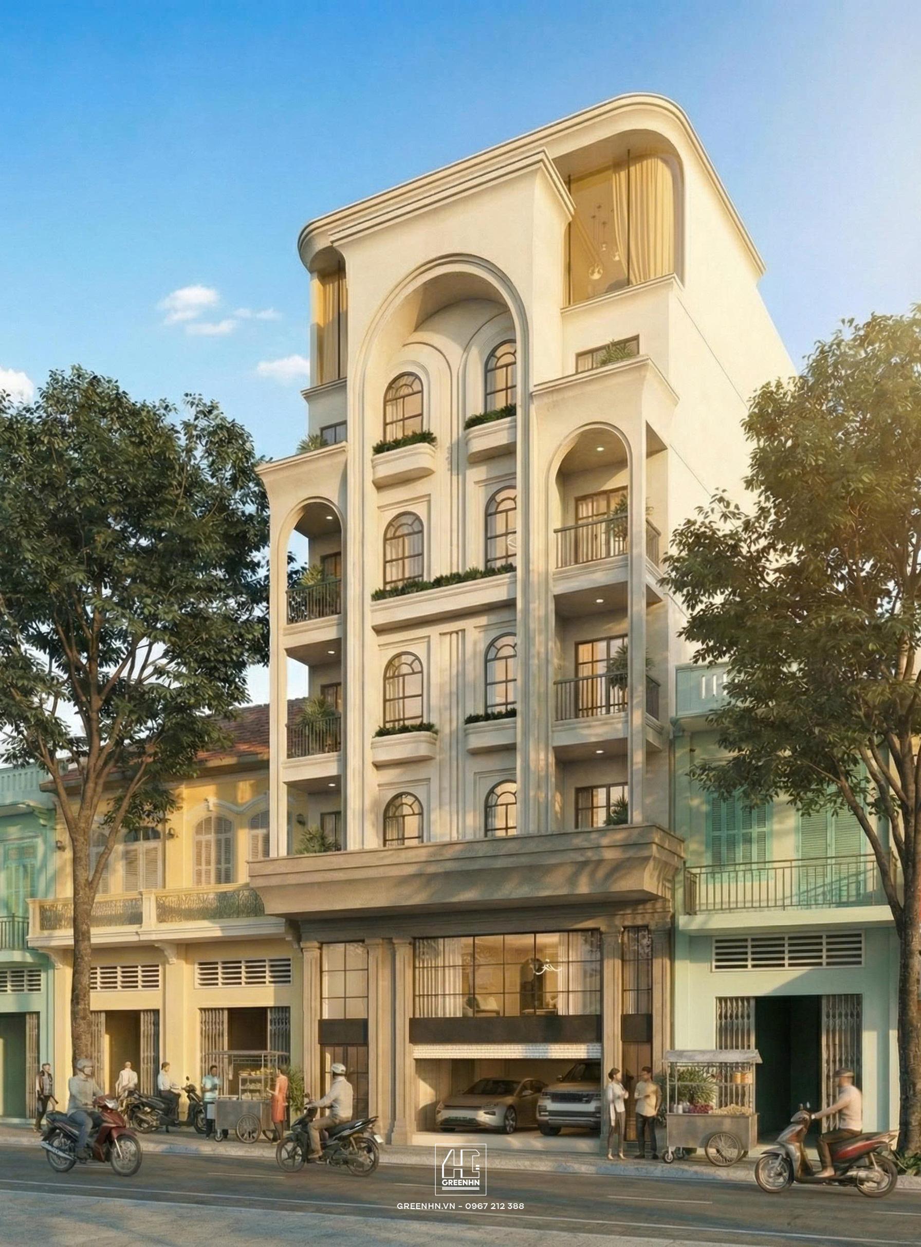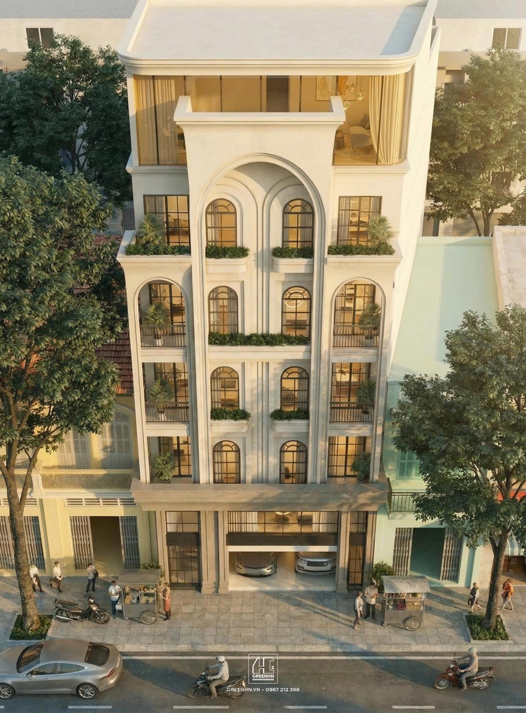 Việc bo góc phần mái/đỉnh công trình cũng là một cách hiện đại hóa tân cổ điển: mềm mại hơn khi nhìn từ xa, giảm cảm giác khối nhà cứng nhắc và giúp mặt đứng bớt cứng trong bối cảnh phố đông.