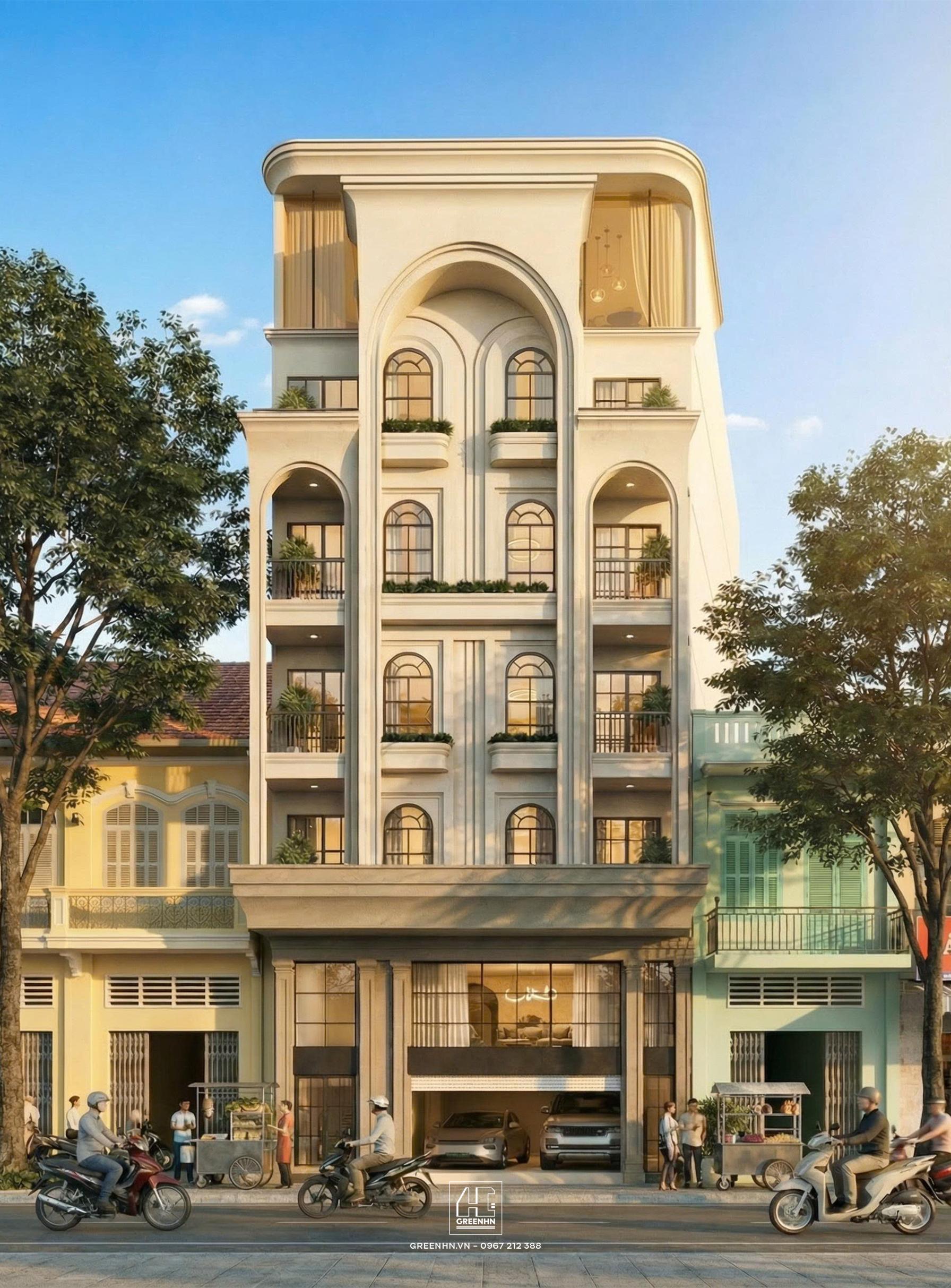 Điểm nhận diện mạnh nhất của công trình nằm ở hệ vòm được triển khai xuyên suốt: từ vòm lớn trung tâm mặt đứng cho đến các vòm logia hai bên. Tuy nhiên, đây không phải vòm cổ điển nặng nề, mà là vòm đương đại: