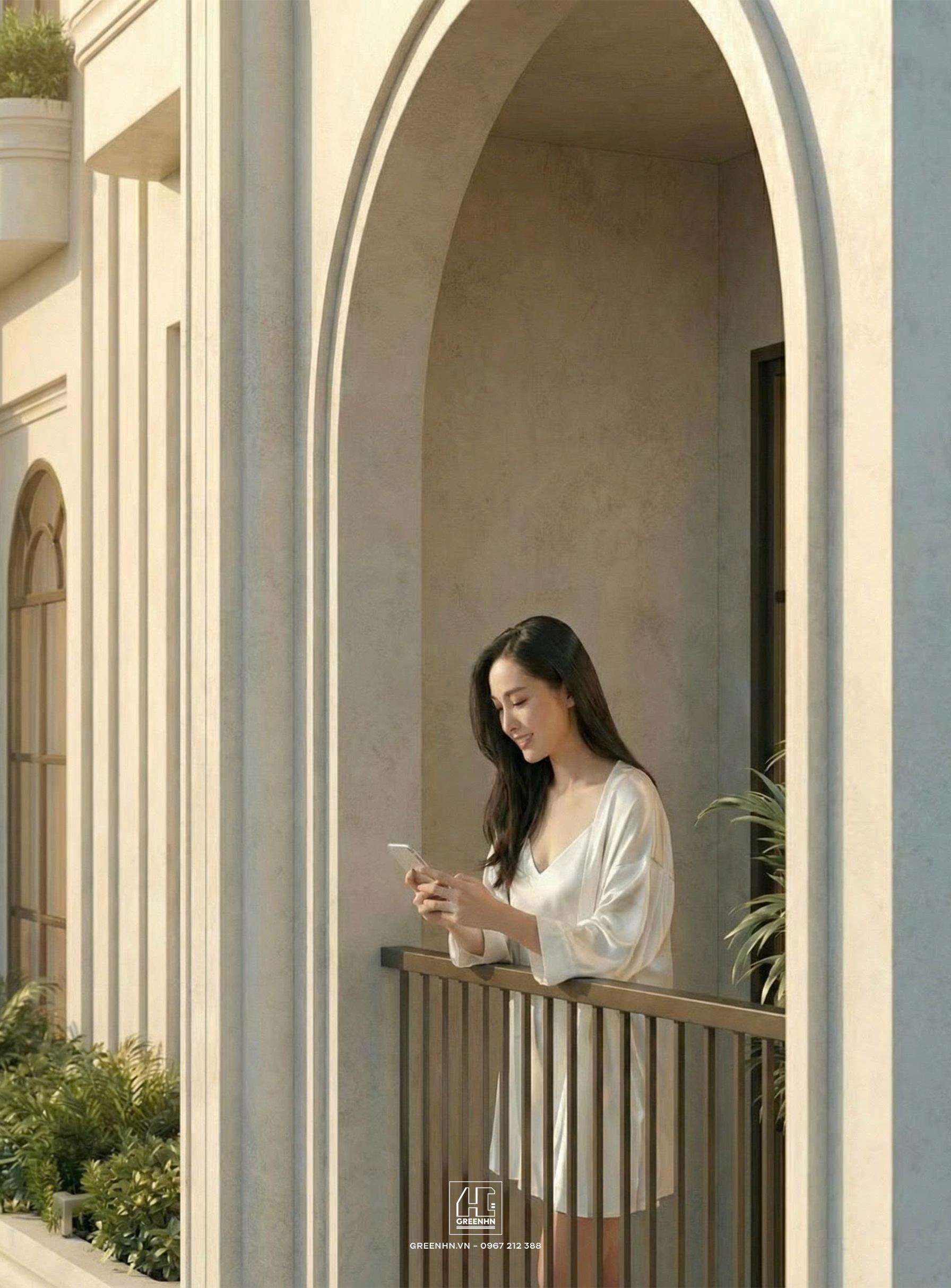 1) Ngôn ngữ phong cách: Tân cổ điển đương đại, nhưng mềm hóa bằng vòm và bo góc