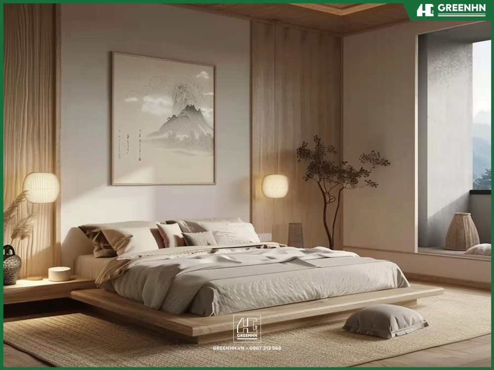 Cây xanh nội thất: Japandi không thể thiếu cây xanh. GreenHN bố trí sẵn các vị trí đặt chậu cây có đèn quang hợp (nếu thiếu sáng) để mang thiên nhiên vào phòng.
