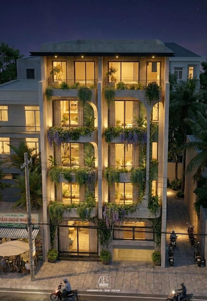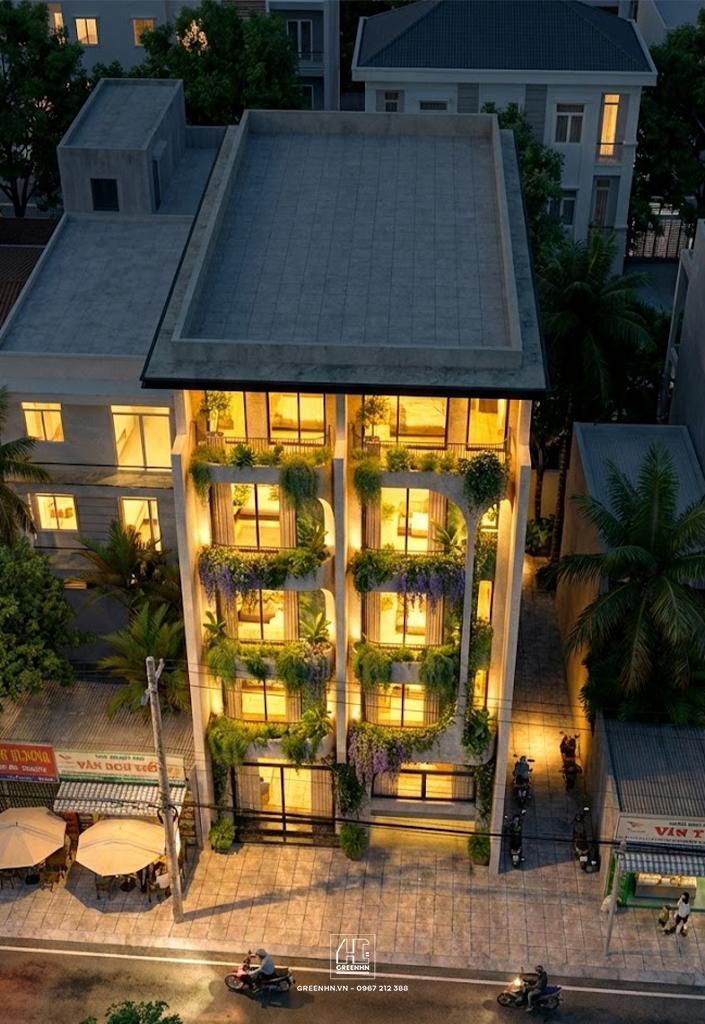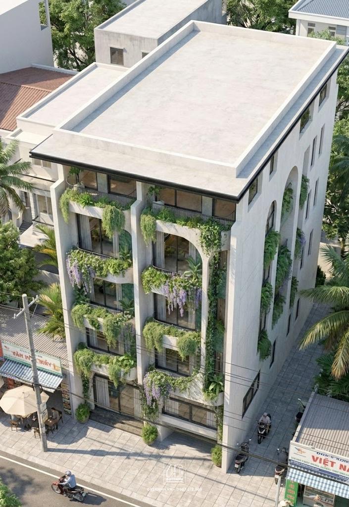 Các trục đứng (cột, mảng tường đặc) được giữ gọn, làm nền cho các mảng ban công xanh và cửa kính.