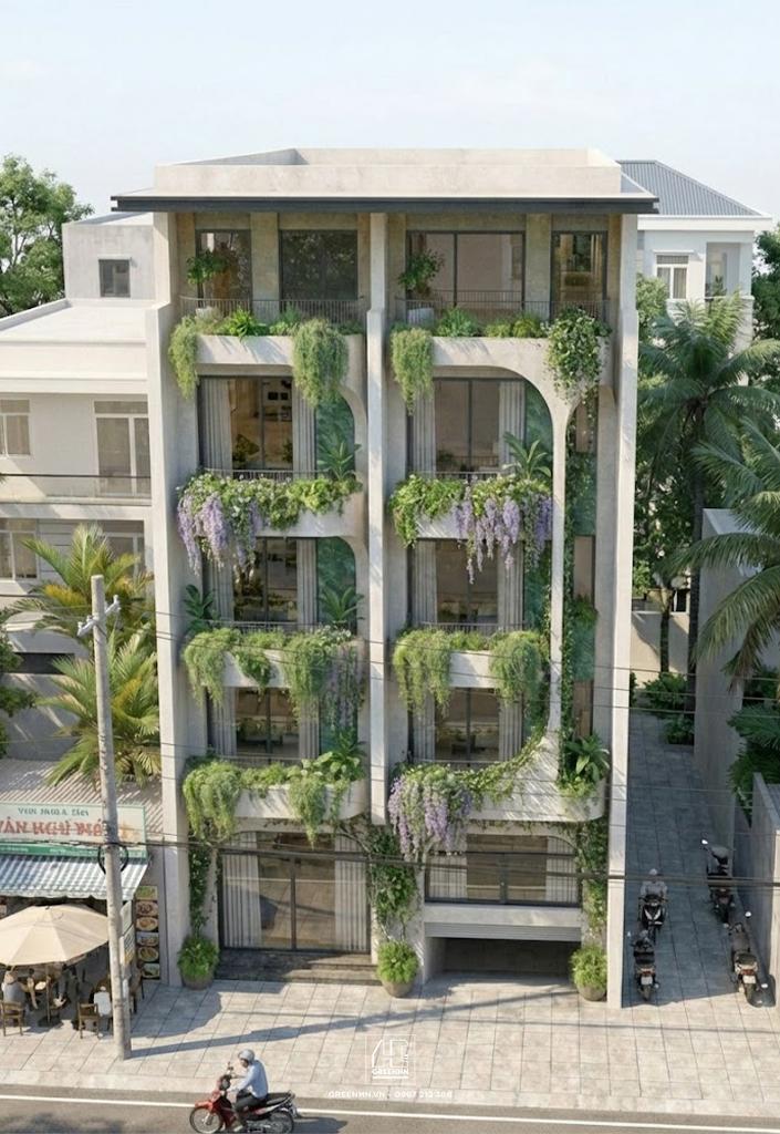 Điểm nhấn lớn nhất của công trình là hệ ban công phủ cây xanh dày đặc, được tổ chức theo từng tầng, từng nhịp cột rõ ràng.