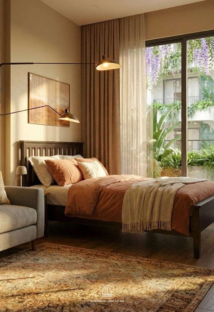 Hệ cửa kính lớn kết hợp ban công sâu cho phép ánh sáng tự nhiên đi sâu vào phòng, nhưng vẫn được kiểm soát bởi cây xanh và độ vươn ban công.