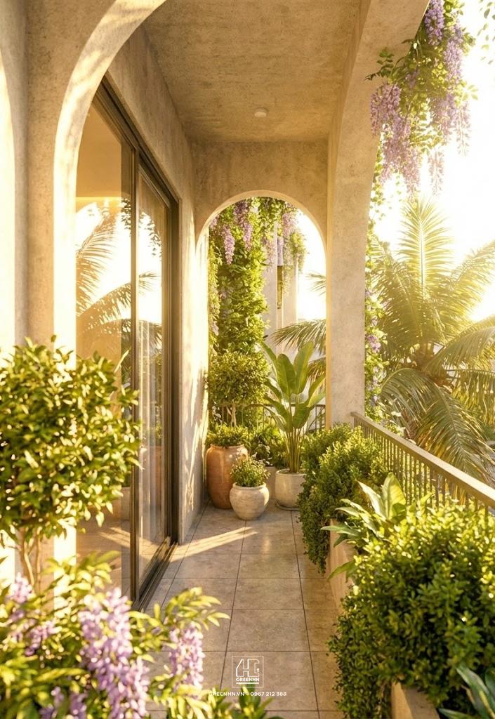 Bảng màu chủ đạo gồm be – xám sáng – xanh cây, kết hợp kính và lan can kim loại tối màu.
