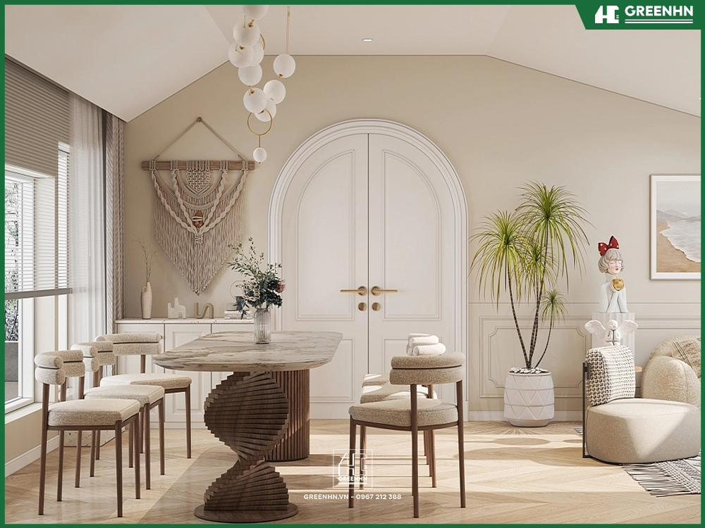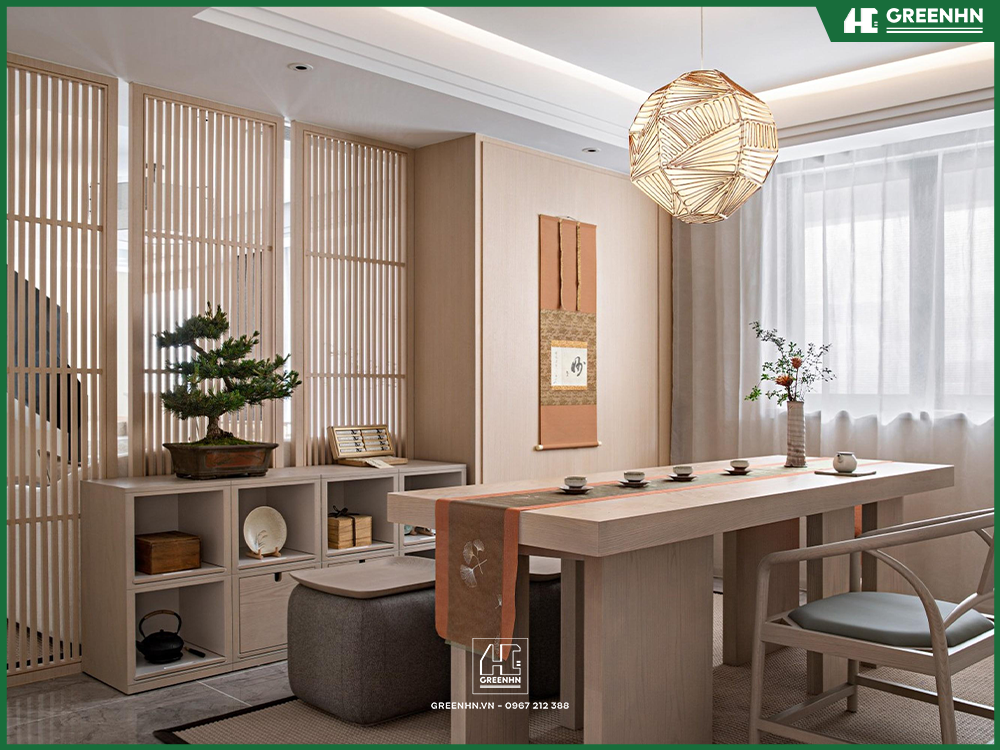 GreenHN tư vấn lựa chọn các loại gỗ tự nhiên hoặc gỗ công nghiệp cao cấp có vân đẹp, kết hợp với ánh sáng tự nhiên và các chi tiết trang trí thủ công để tạo nên chất Japandi đúng điệu. Cây xanh là điểm nhấn luôn được các KTS ưu tiên khi tư vấn về phong cách này.