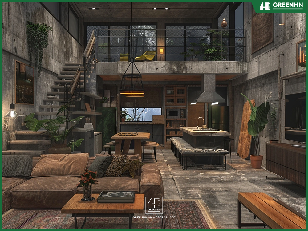 GreenHN áp dụng: Chúng tôi chú trọng kỹ thuật thi công bê tông trần và xử lý vật liệu thô để đảm bảo tính thẩm mỹ cao nhất