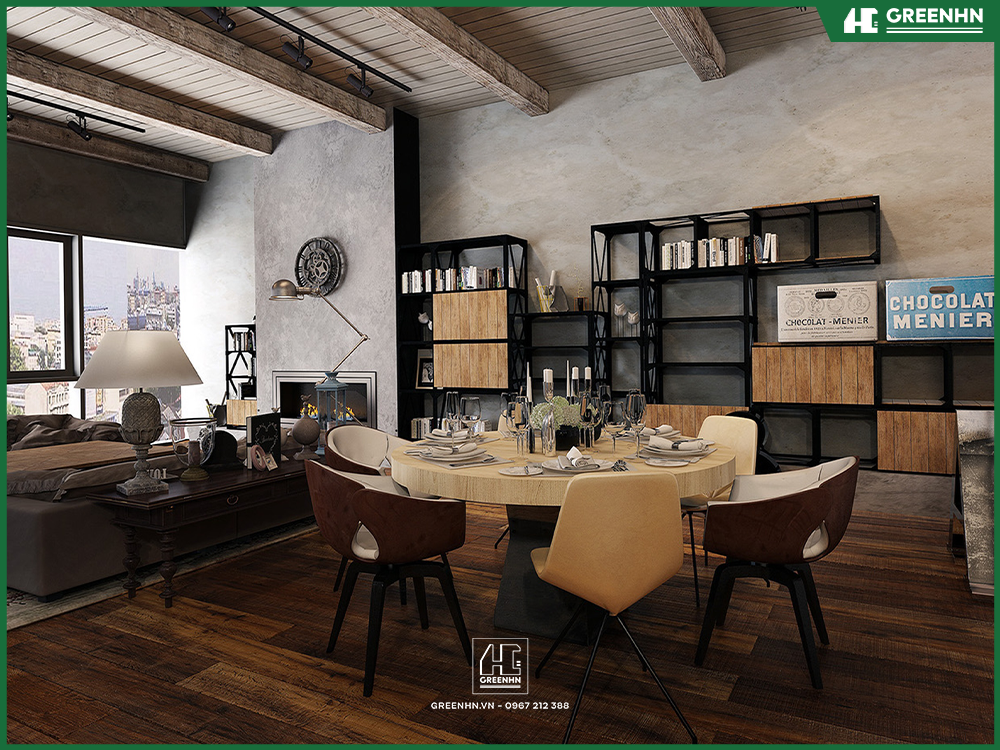Đặc điểm: Tôn vinh vẻ đẹp nguyên bản của vật liệu như bê tông mài, tường gạch mộc, khung thép tiền chế và đường ống kỹ thuật để lộ (được sắp xếp nghệ thuật). Không gian thường mở, trần cao, thoáng đãng.