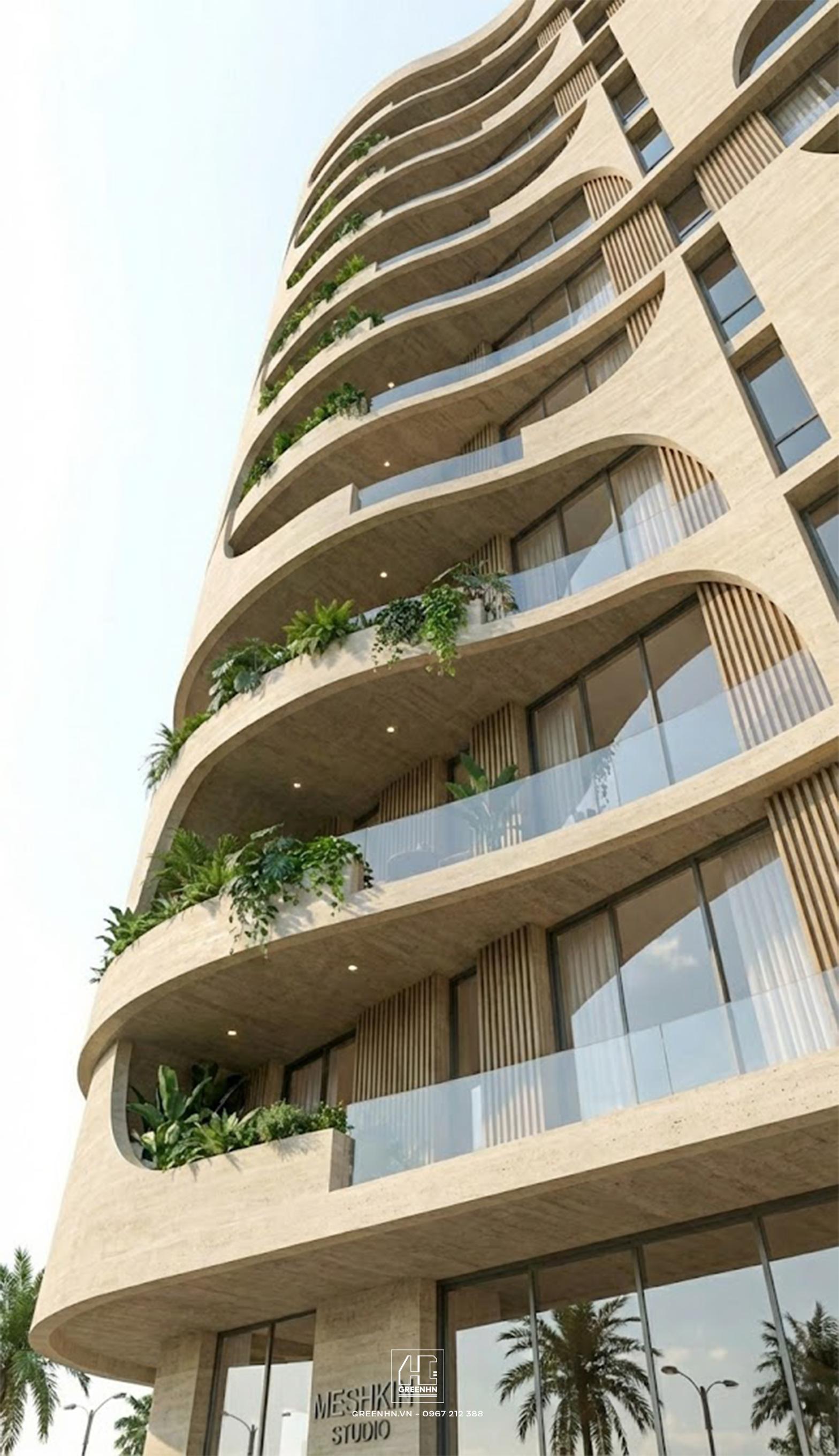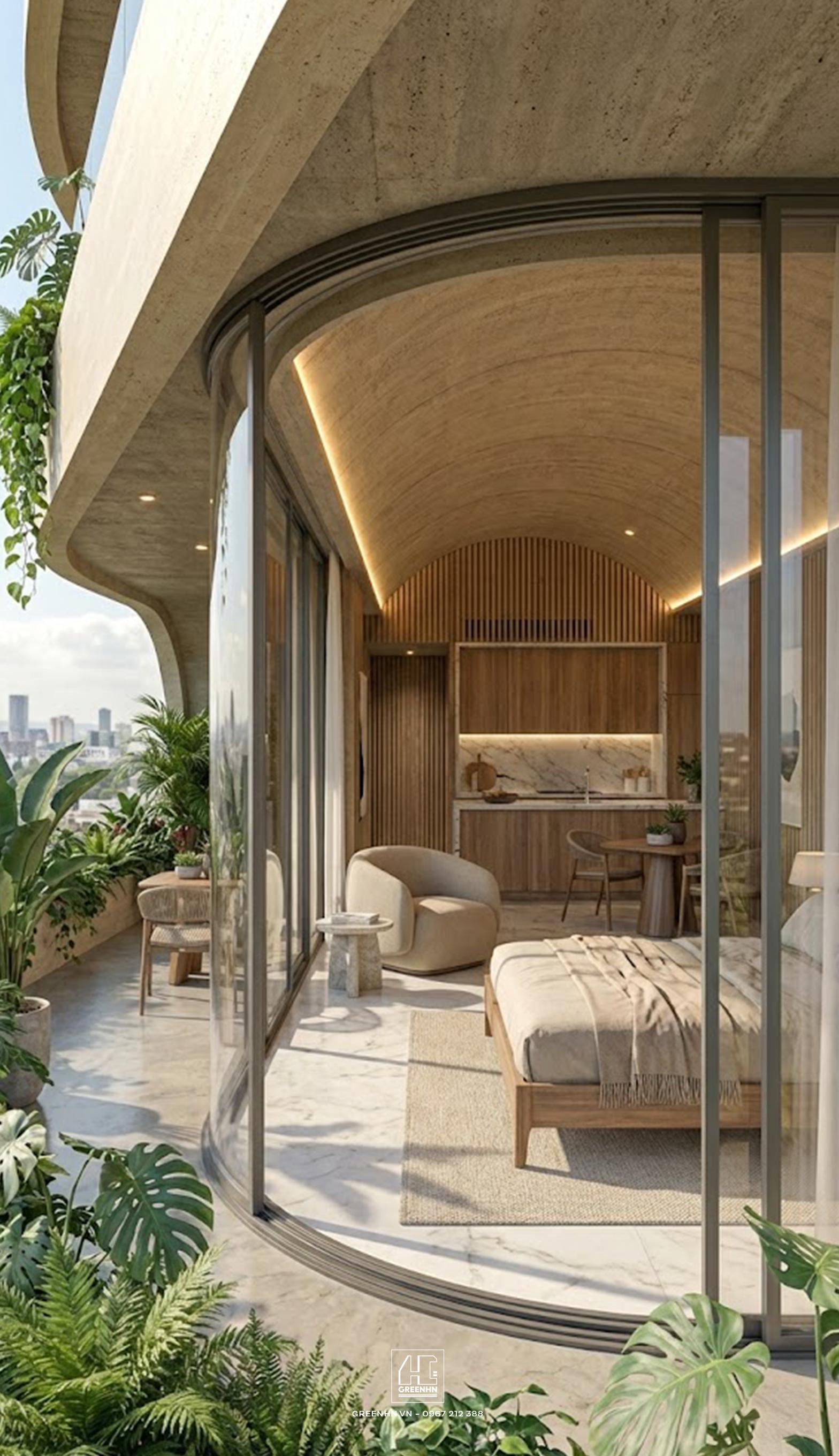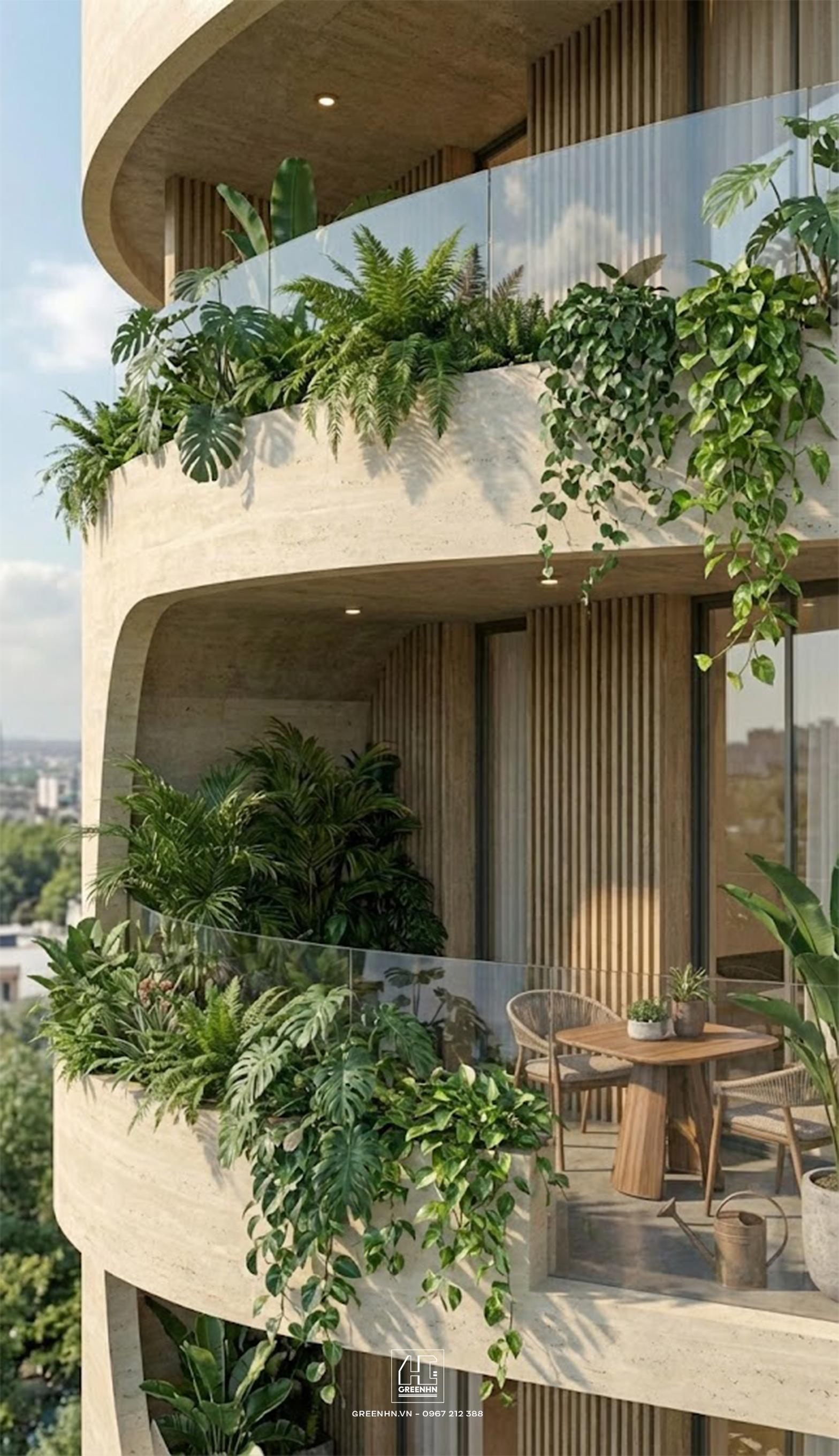 Lớp giữa: ban công bo cong, đủ sâu để trở thành không gian thư giãn thực sự