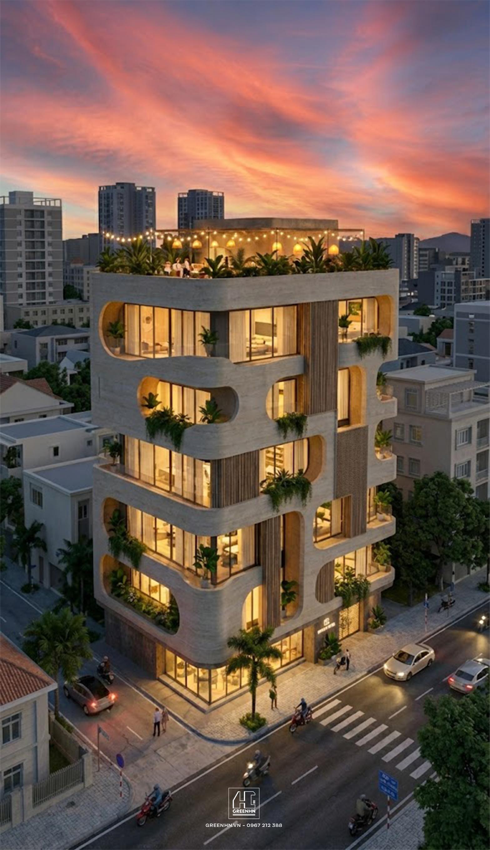 Khách sạn Lamelia là một ví dụ tiêu biểu cho xu hướng kiến trúc đương đại kết hợp sinh thái nơi công trình không chỉ đáp ứng công năng lưu trú, mà còn tạo ra trải nghiệm không gian mang tính nghỉ dưỡng ngay trong đô thị.