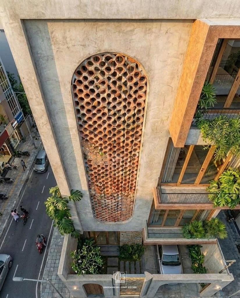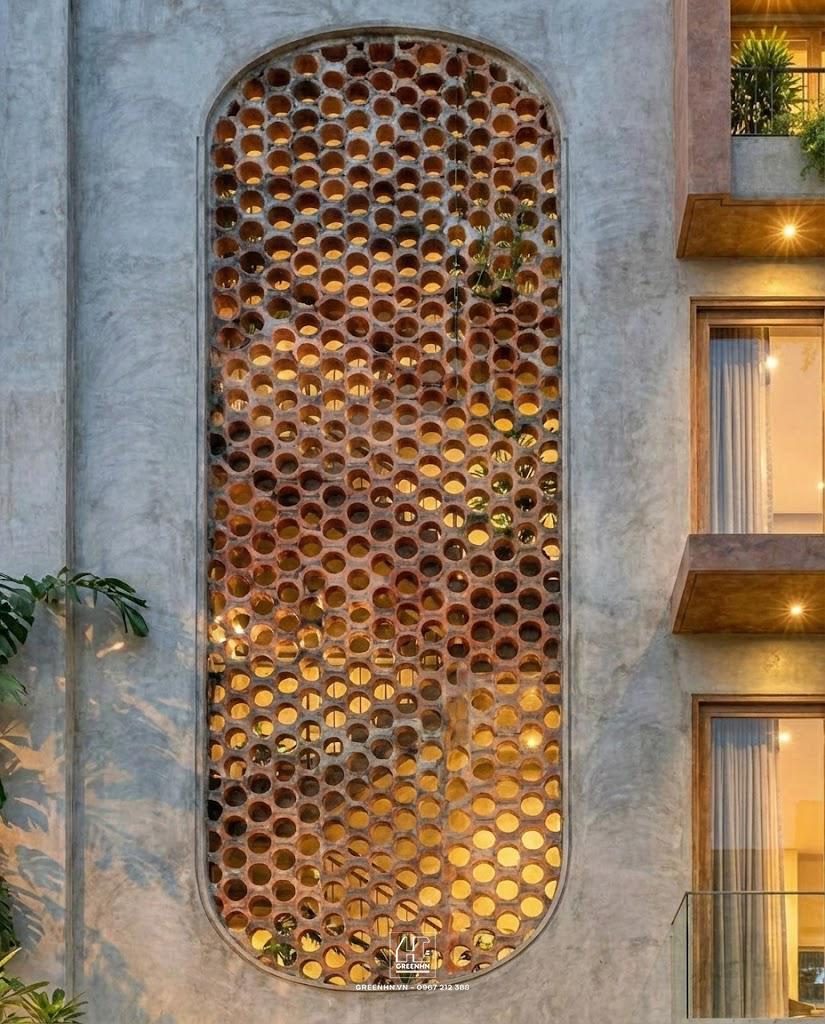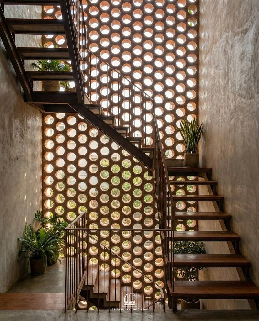 Mặt đứng "kép" (Double-skin facade): Lớp gạch bông gió đóng vai trò như một tấm rèm tự nhiên, giúp giảm bức xạ nhiệt, đảm bảo sự riêng tư nhưng vẫn duy trì kết nối thoáng đãng với bên ngoài.