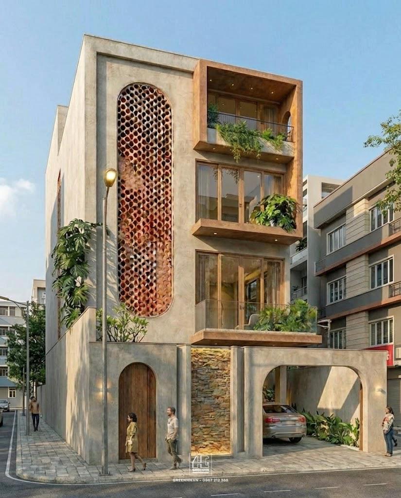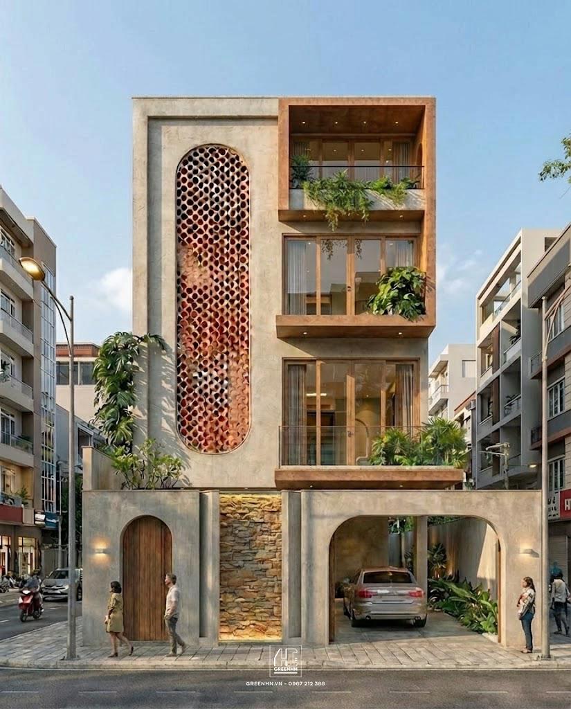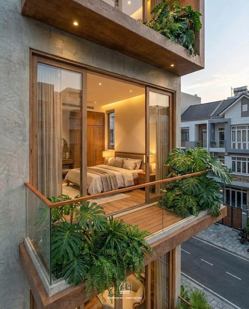 Khoảng đệm xanh: Hệ thống bồn cây tại ban công và giếng trời giúp điều tiết vi khí hậu và mang thiên nhiên len lỏi vào từng góc nhà.