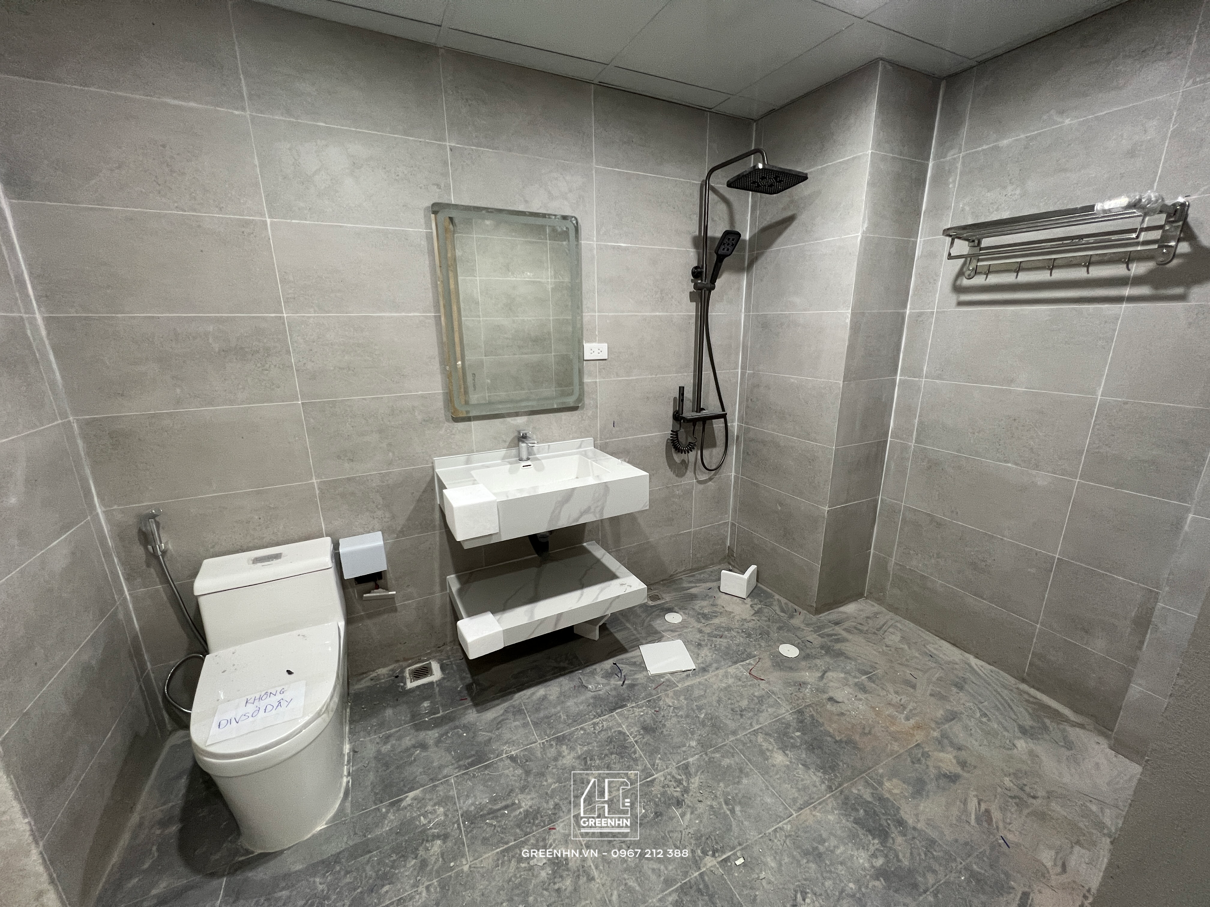 Thiết bị vệ sinh được lắp đặt chuẩn chỉ: Lavabo bàn đá hiện đại, gương LED cảm ứng, sen cây tắm đứng. Không gian này đạt chuẩn khách sạn 3 sao, là yếu tố then chốt để khách thuê "xuống tiền" chốt phòng.