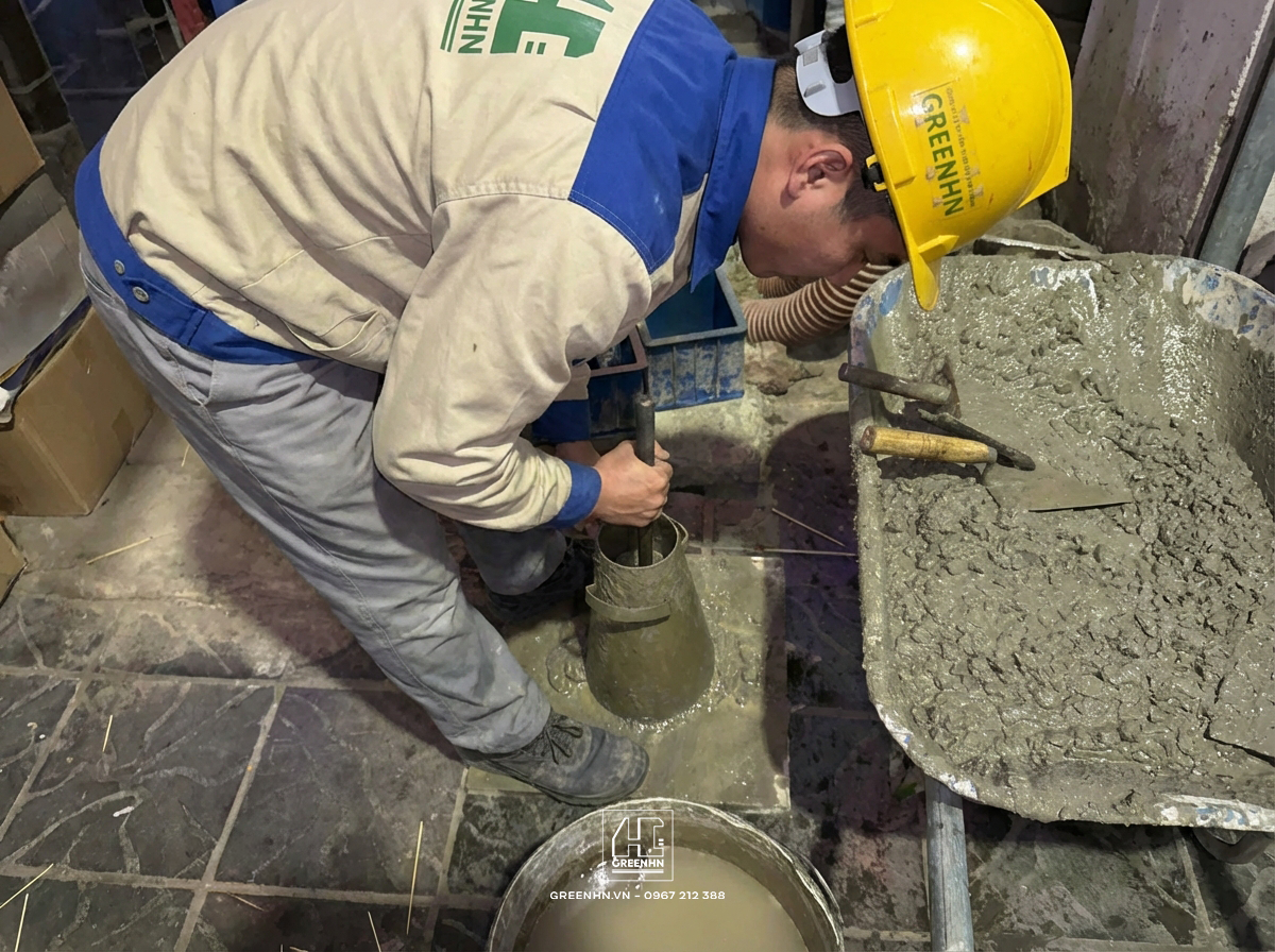 Kỹ sư GreenHN trực tiếp rút côn kiểm tra. Bê tông phải đủ độ dẻo để đi qua vòi bơm dài mà không bị tắc, nhưng không được quá lỏng (nhiều nước) để tránh nứt mặt sàn.