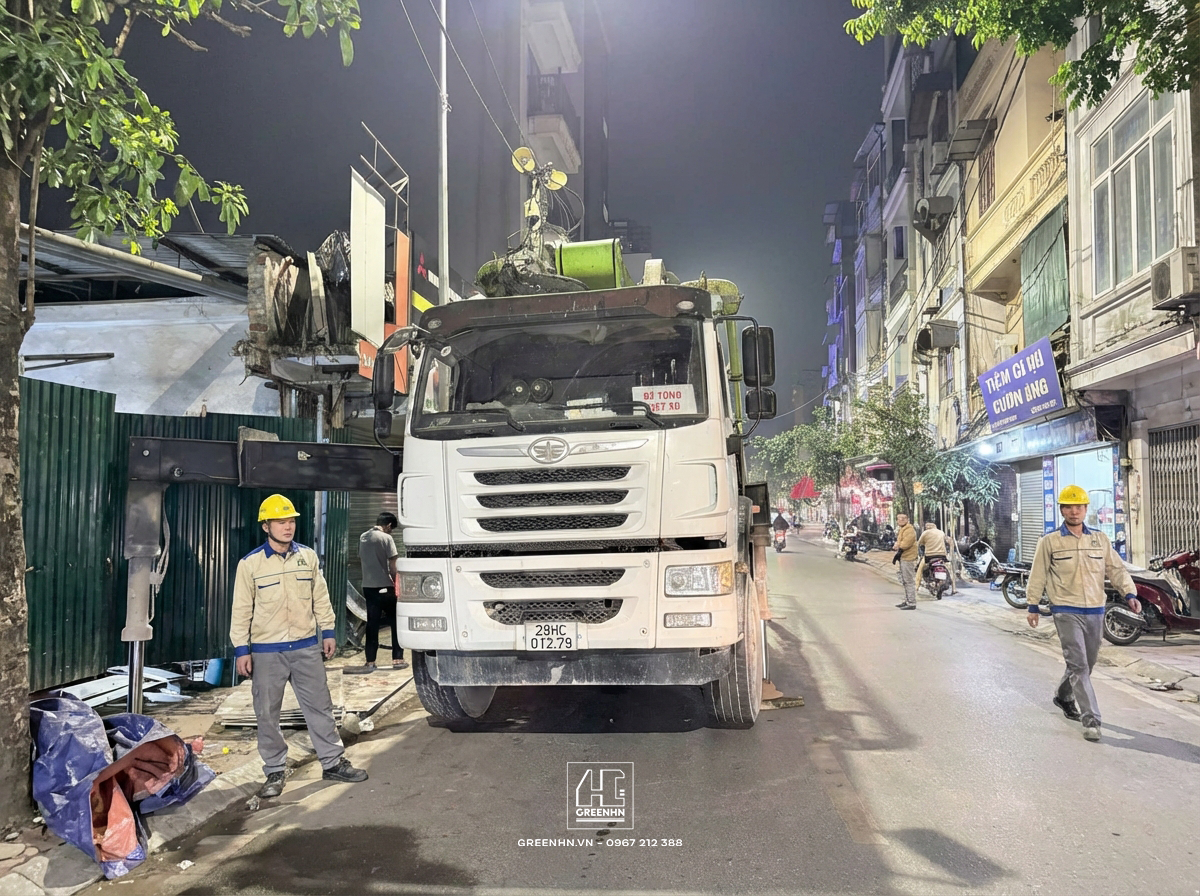 Khác với những công trình trong ngõ phải vất vả nối ống, lợi thế mặt tiền đắc địa của nhà anh Minh cho phép GreenHN sử dụng giải pháp thi công Tốc độ & Mạnh mẽ nhất. Tuy nhiên, việc vận hành một thiết bị hạng nặng ngay trên lòng đường phố đòi hỏi những quy chuẩn an toàn cực kỳ khắt khe. Hãy cùng mục sở thị ca đổ bê tông "thần tốc" này.
