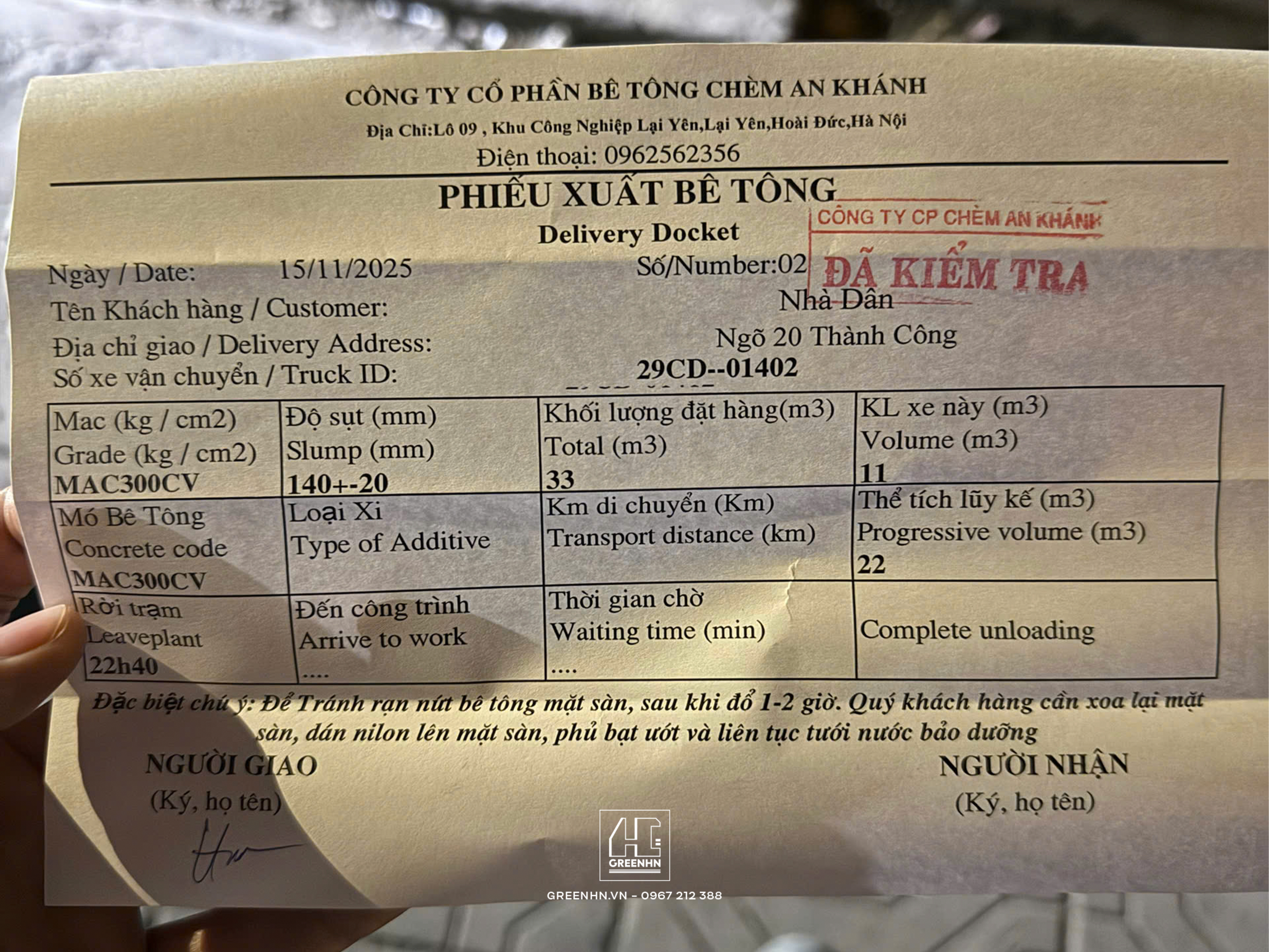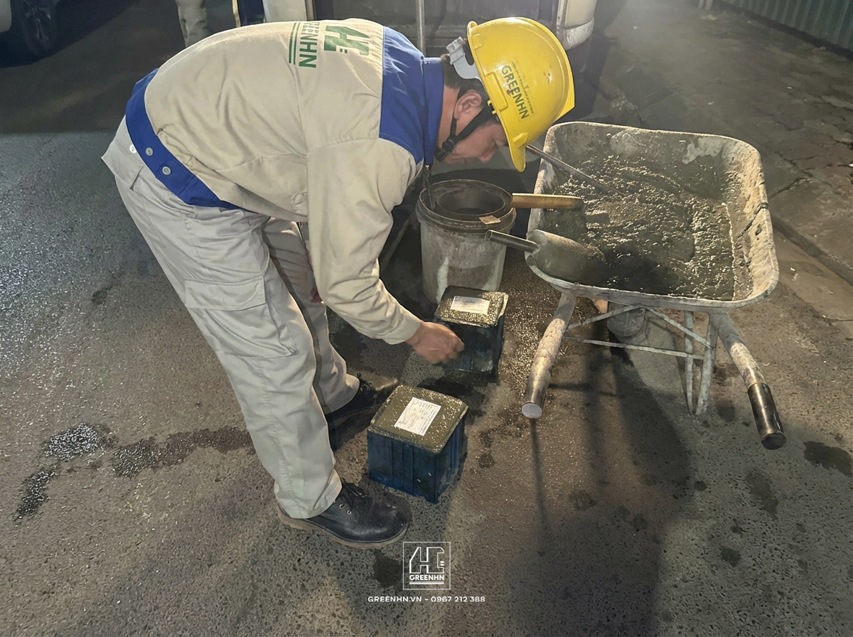 Quy trình kiểm tra kẹp chì, đo độ sụt, lấy mẫu... không phải là "diễn" để chụp ảnh, đó là quy định bắt buộc tại mọi công trình của GreenHN dù lớn hay nhỏ.