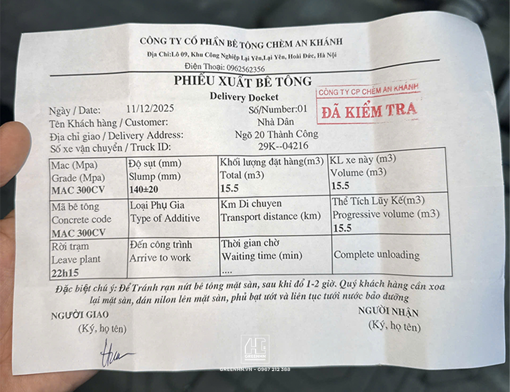 Đây là bước "bổ sung" quan trọng mà GreenHN luôn thực hiện để đảm bảo bê tông đạt cường độ thiết kế tối đa (R28).
