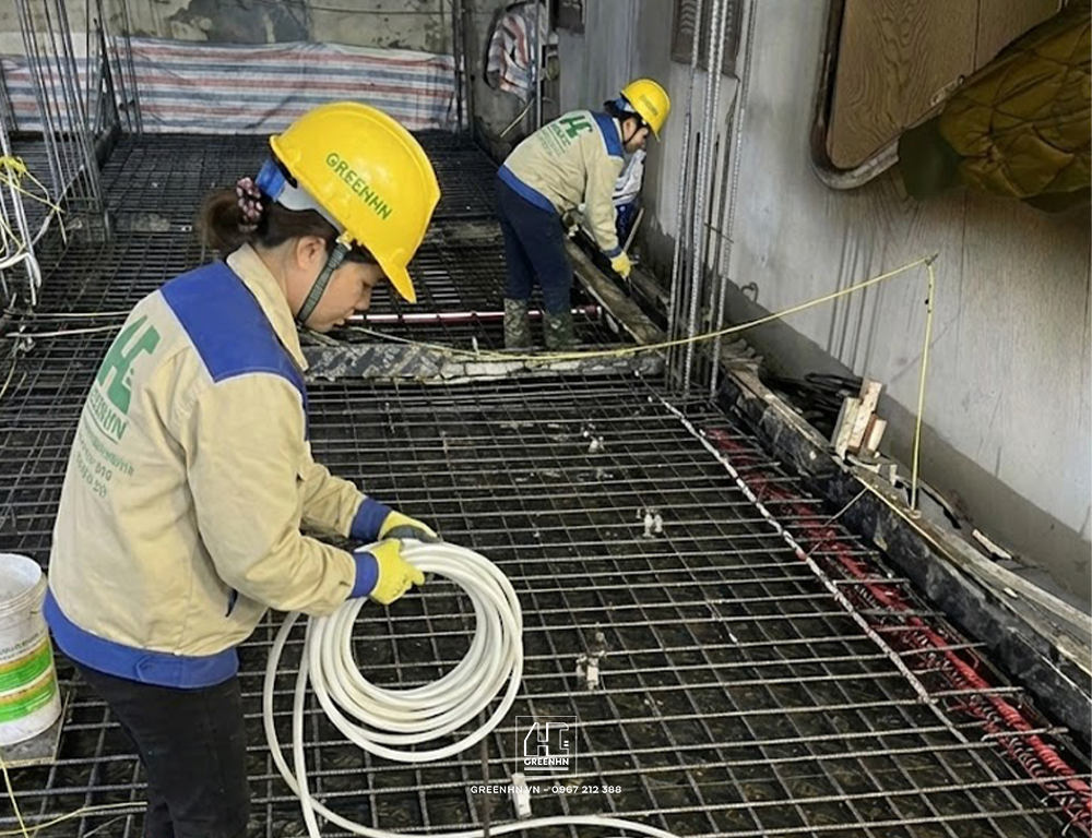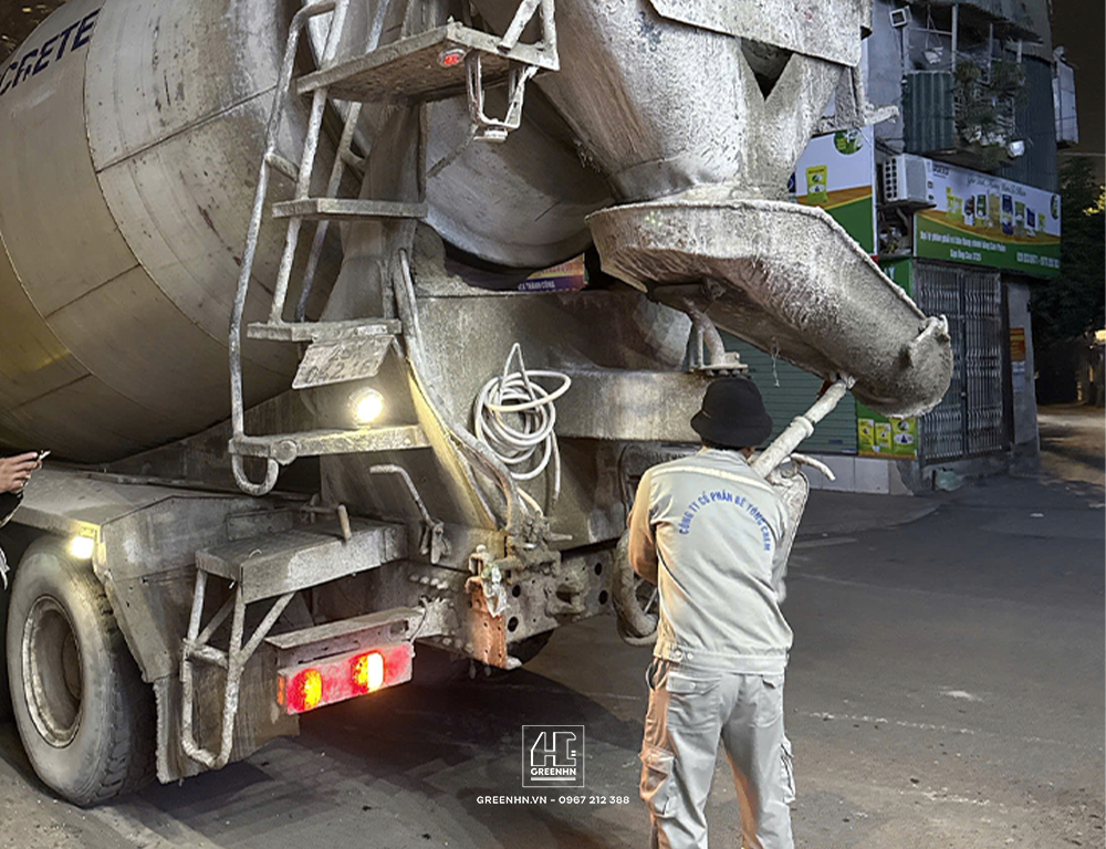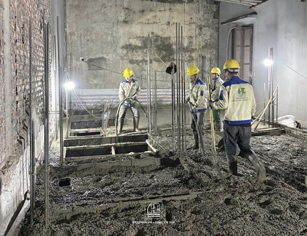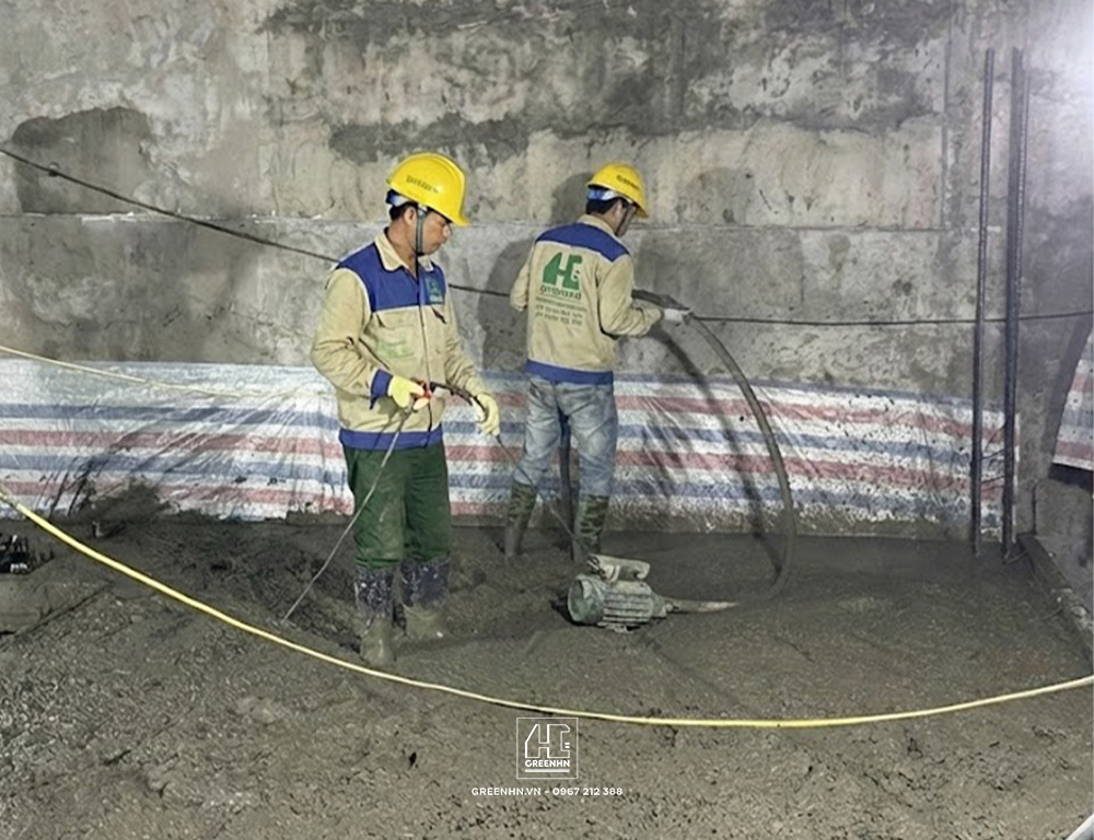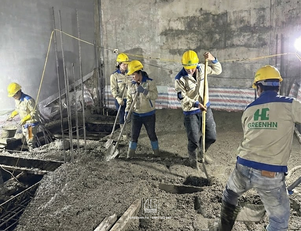 Những người thợ GreenHN chân lội trong bê tông ướt, tay ghì chặt máy đầm dùi rung bần bật.