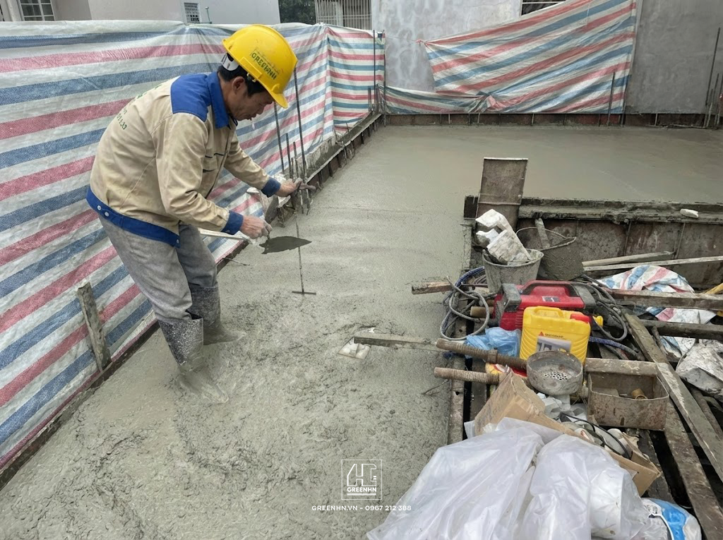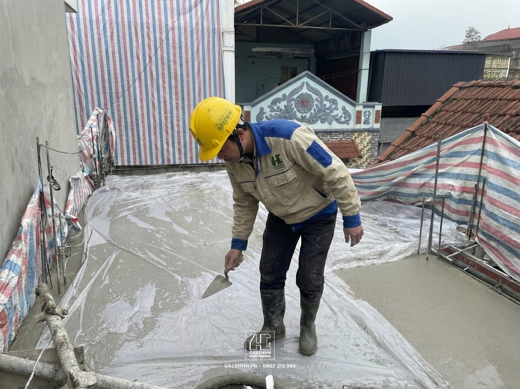 Đây không chỉ là niềm vui của gia chủ khi thấy ngôi nhà mơ ước dần hình thành, mà còn là minh chứng cho sự cam kết về tiến độ và chất lượng của GreenHN. Tại giai đoạn "khóa đuôi" phần thô này, kỹ thuật đổ bê tông mái đóng vai trò quyết định đến khả năng chống thấm và cách nhiệt cho toàn bộ ngôi nhà trong tương lai.