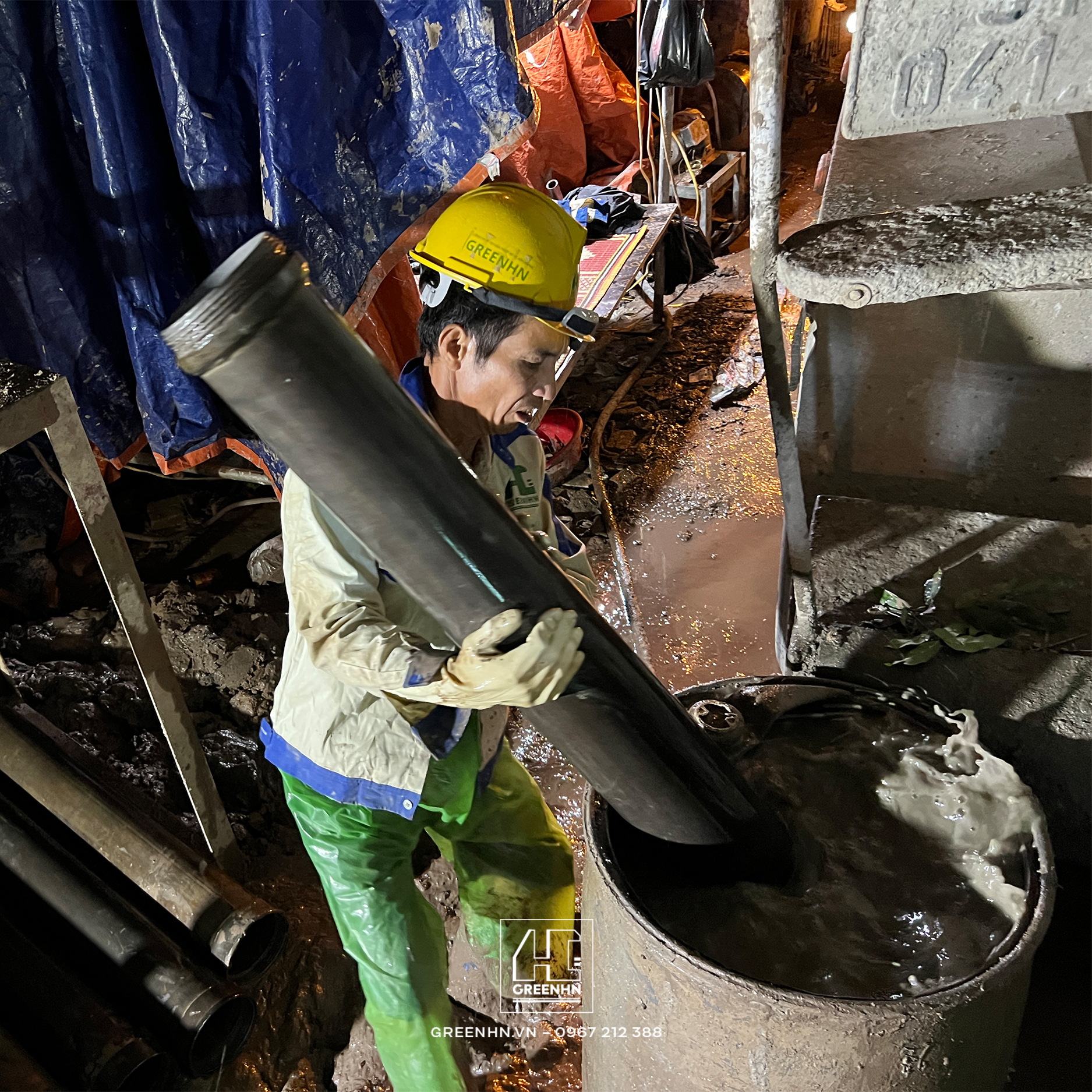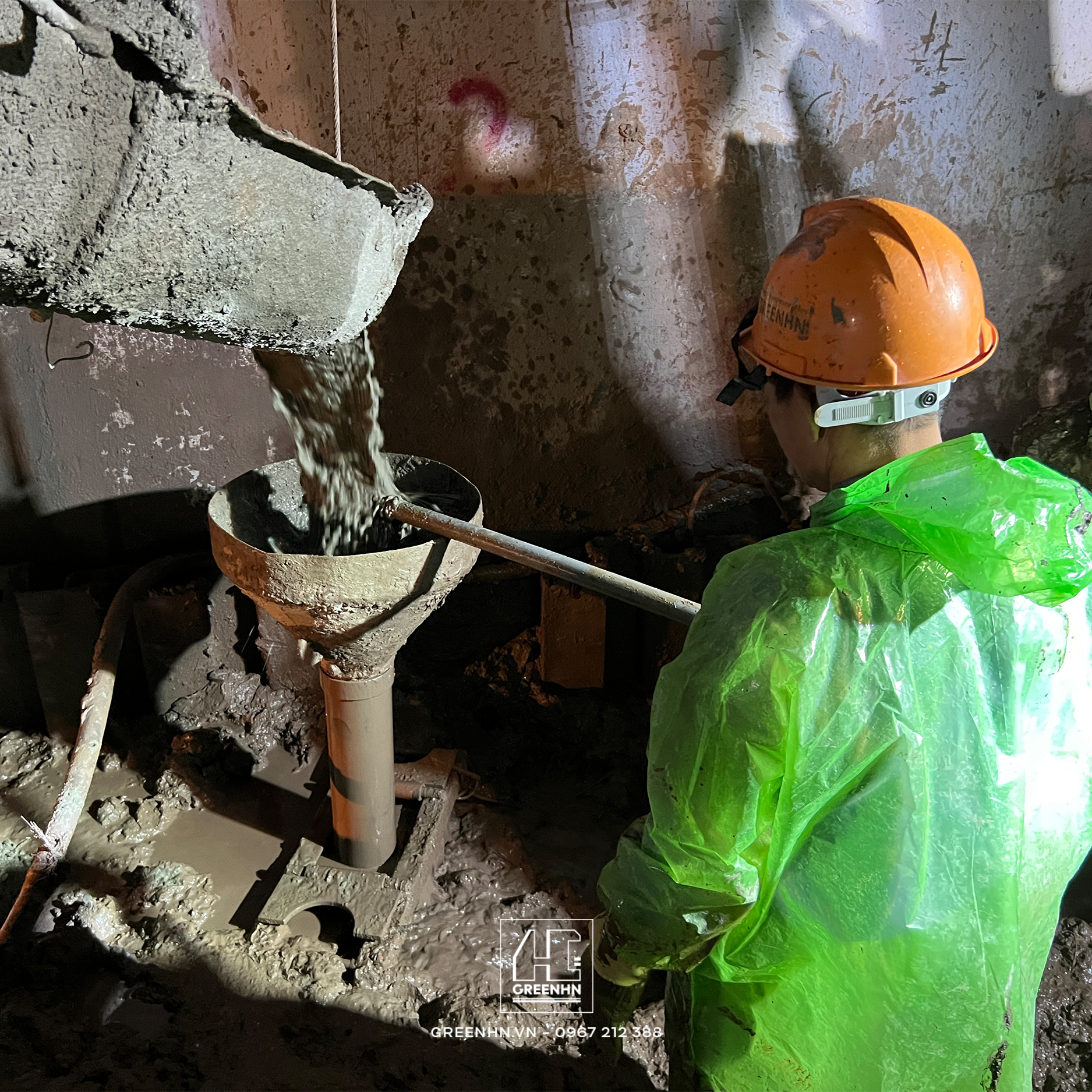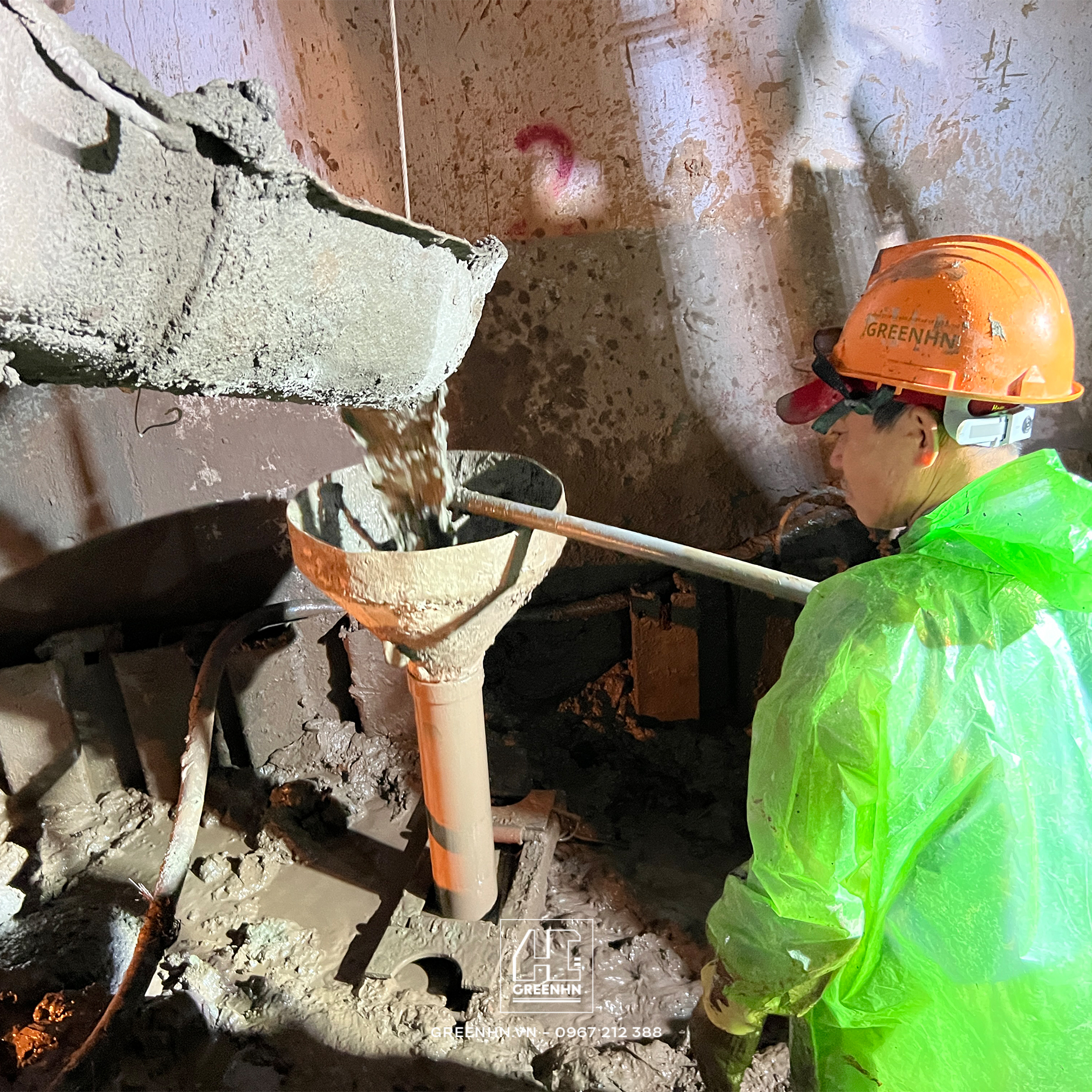 Quá trình bơm bê tông xuống lòng đất là giai đoạn căng thẳng nhất. Kỹ sư GreenHN phải giám sát chặt chẽ qua hệ thống ống dẫn (Tremie pipe):