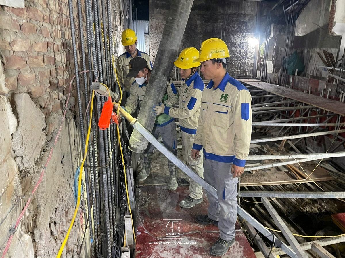 Khác với đổ sàn, đổ vách hầm rất dễ bị rỗ tổ ong (do cốt thép dày và vách cao). Đội thợ GreenHN tuân thủ: