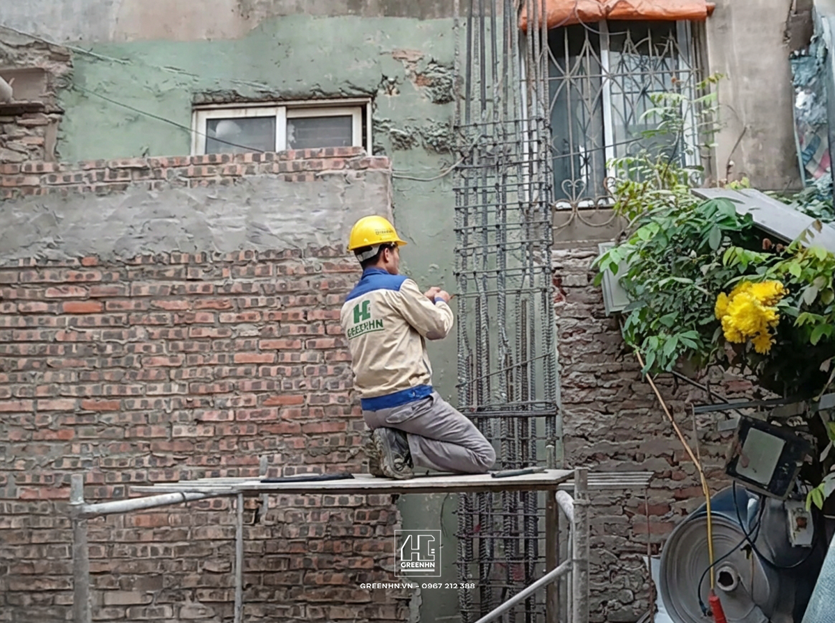 Giải pháp: Tại nhà chú Toản, GreenHN sử dụng khoan cấy Râu thép D8 hoặc D10 vào cột bê tông (khoảng cách 500mm/thanh) trước khi xây chèn gạch vào.