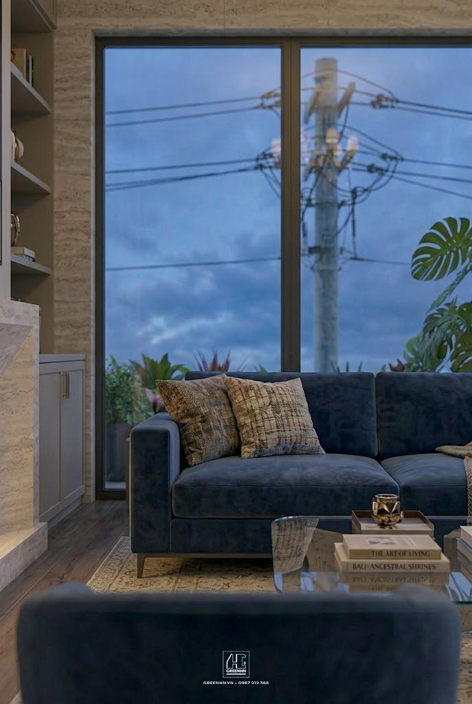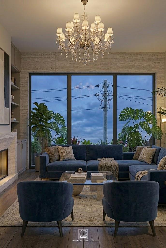 Điểm nhấn: Bộ sofa vải nhung màu xanh Sapphire sang trọng đặt cạnh lò sưởi ốp đá Travertine tinh tế.
