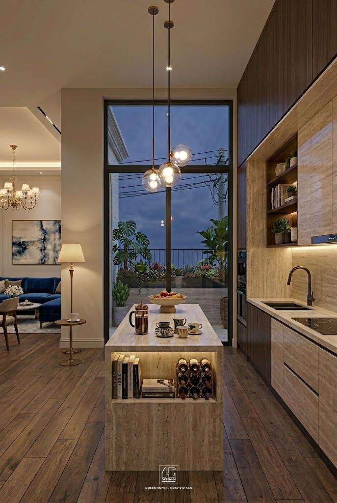 Sự kết nối: Không gian bếp mở thông với bàn ăn cao cấp và view nhìn ra ban công xanh mát qua hệ cửa vòm/chữ nhật tinh tế.
