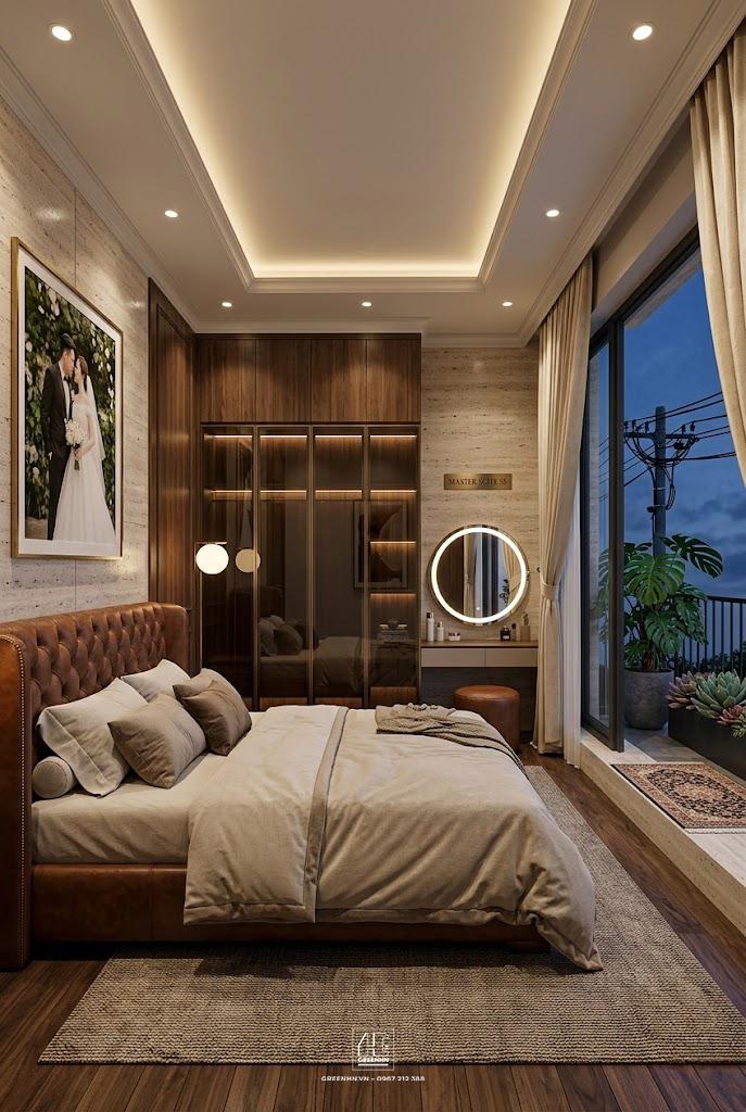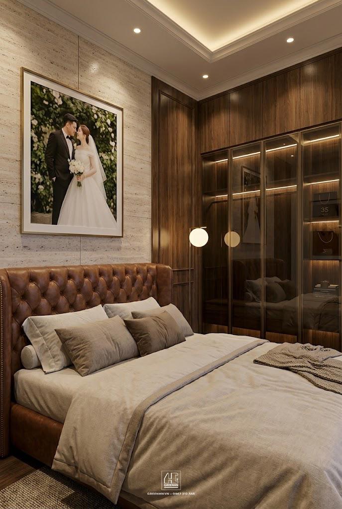 Nội thất: Giường ngủ bọc da nâu kiểu Chesterfield sang trọng kết hợp cùng vách ốp gỗ óc chó rich wood.