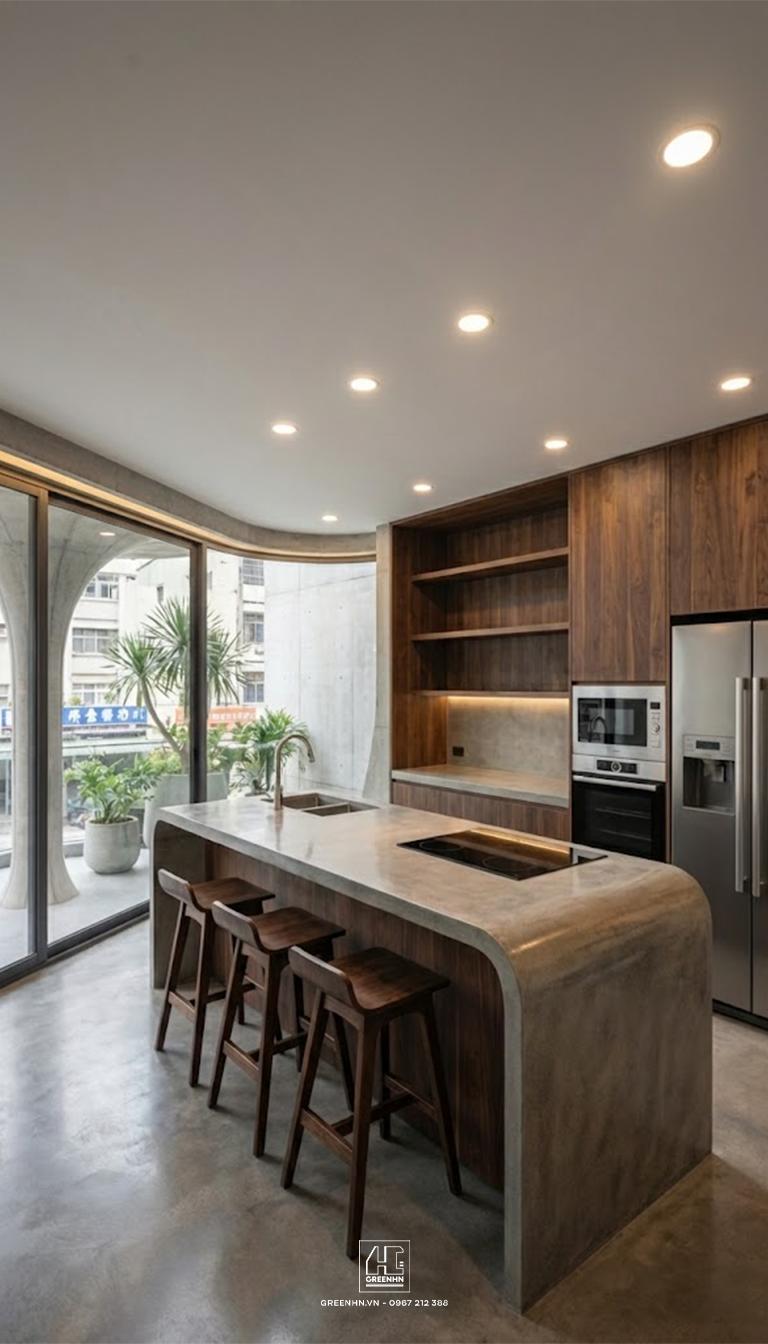 Phòng Bếp: Đảo bếp bê tông lớn kết hợp với tủ bếp gỗ óc chó ấm áp và thiết bị âm tủ hiện đại tạo nên một không gian nấu nướng vừa tiện nghi vừa thẩm mỹ.