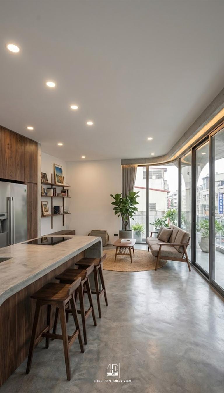 Greenhn đã tạo ra một không gian sinh hoạt chung thông tầng ấn tượng, nơi các ranh giới được xóa nhòa, mang đến cảm giác rộng rãi và thoáng đãng. Hệ thống vách kính cong lớn mở tầm nhìn ra phố, đồng thời mang ánh sáng tự nhiên tràn ngập khắp ngôi nhà.