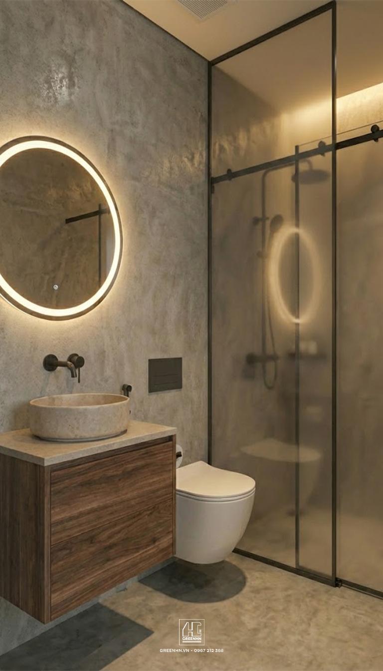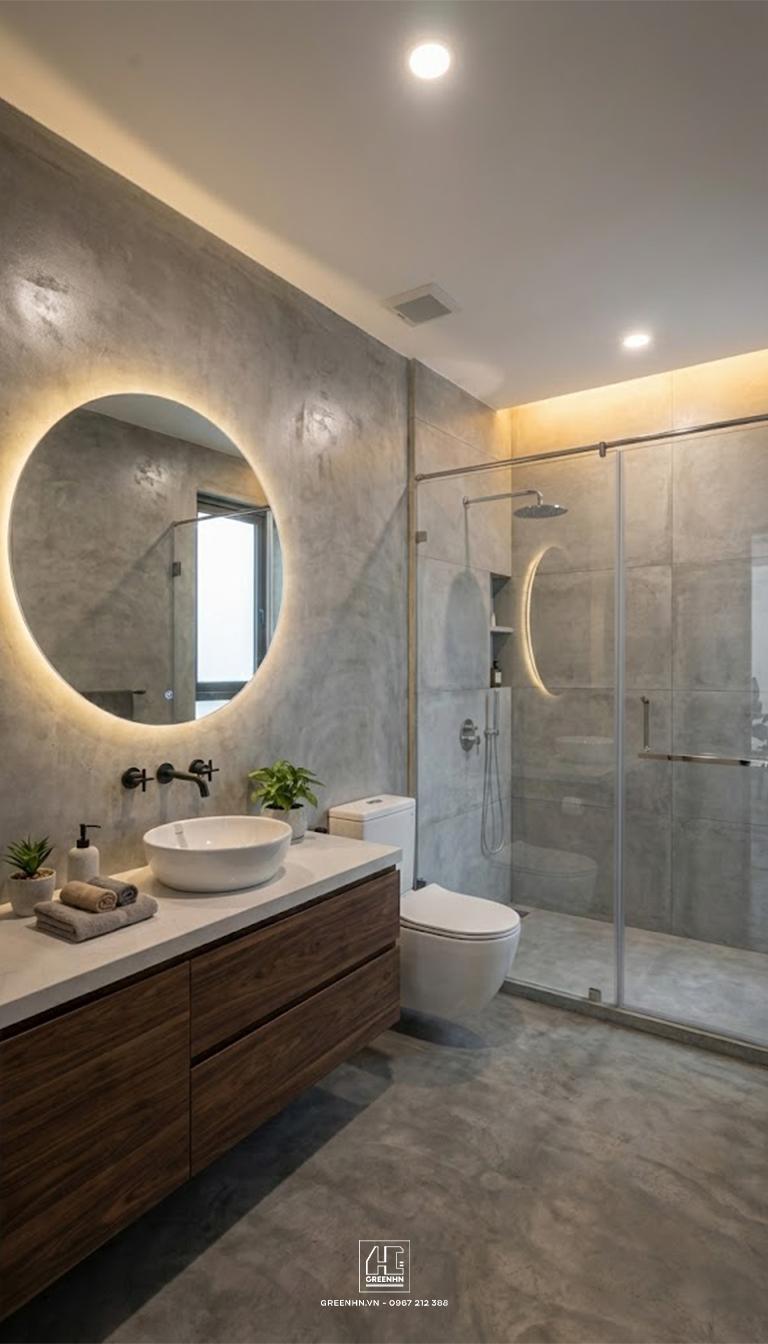 Phòng Tắm: Tường và sàn bê tông mài, gương tròn đèn LED hắt sáng, chậu rửa đặt bàn, tủ lavabo gỗ óc chó và sen tắm âm tường đen mờ tạo nên một không gian thư giãn như spa tại nhà.