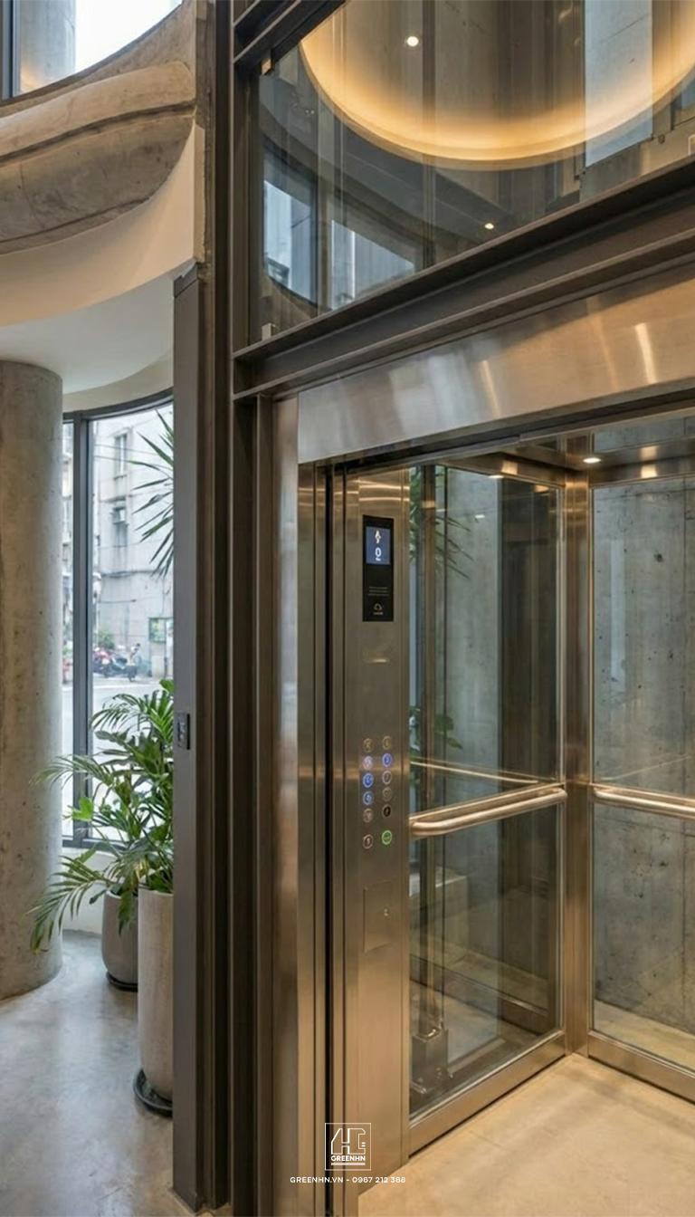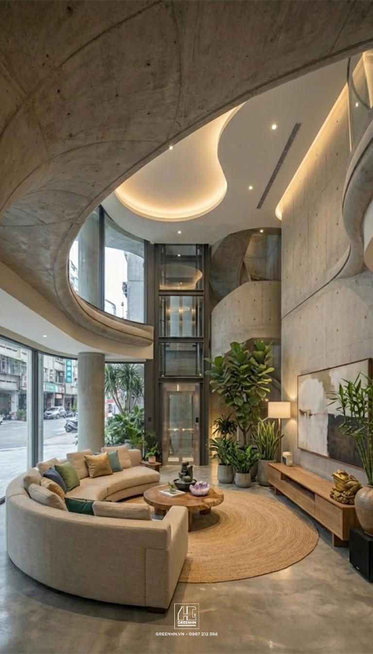 Không gian thông tầng lớn là chìa khóa để tối ưu hóa diện tích và mang ánh sáng tự nhiên vào nhà. Greenhn đã tận dụng tối đa lợi thế này bằng cách sử dụng hệ thống vách kính cong lớn và vườn trong nhà, tạo nên một không gian "thở" giữa lòng đô thị.