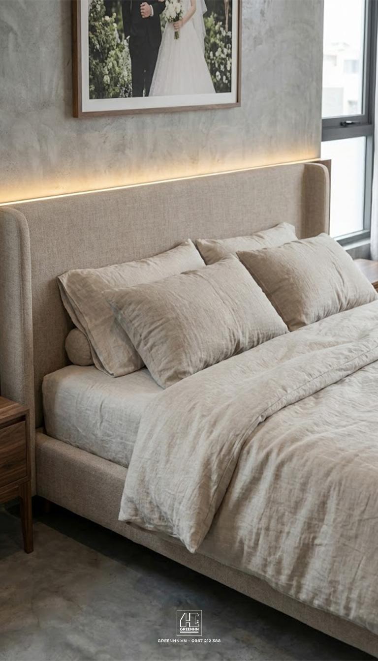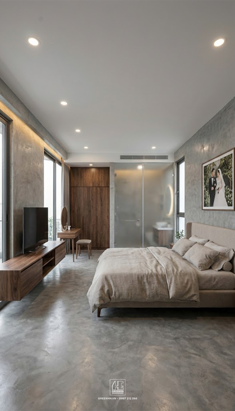 Phòng Ngủ Master: Trần bê tông uốn lượn, vách kính mờ phân chia không gian, nội thất gỗ óc chó tinh tế và giường bọc nỉ màu be tạo nên một không gian nghỉ ngơi thư thái và yên bình.