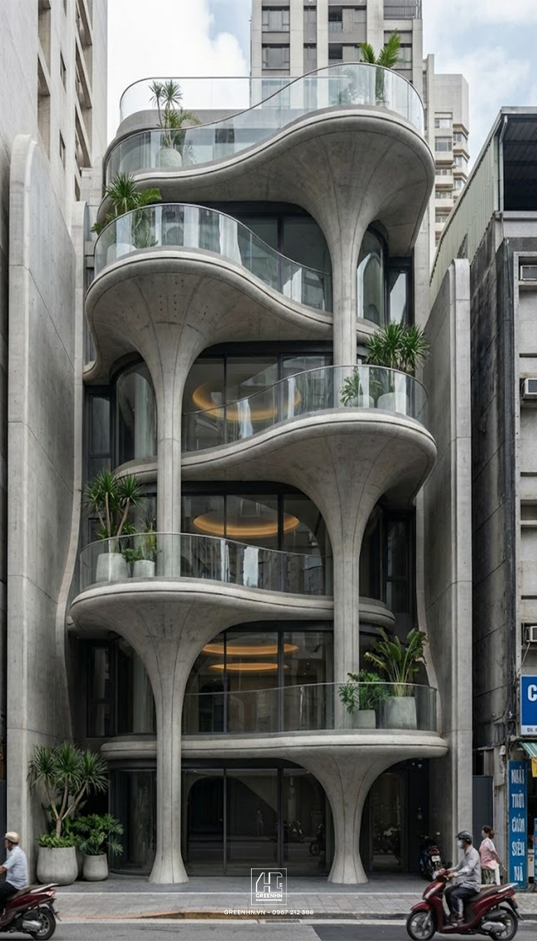 Điểm nhấn kiến trúc mạnh mẽ và dễ nhận biết nhất của The Visual chính là hệ trần và vách bê tông uốn lượn mềm mại. Đây là một kỹ thuật thi công phức tạp, đòi hỏi tay nghề cao, thể hiện sự bứt phá của Greenhn trong việc chinh phục các vật liệu thô mộc.